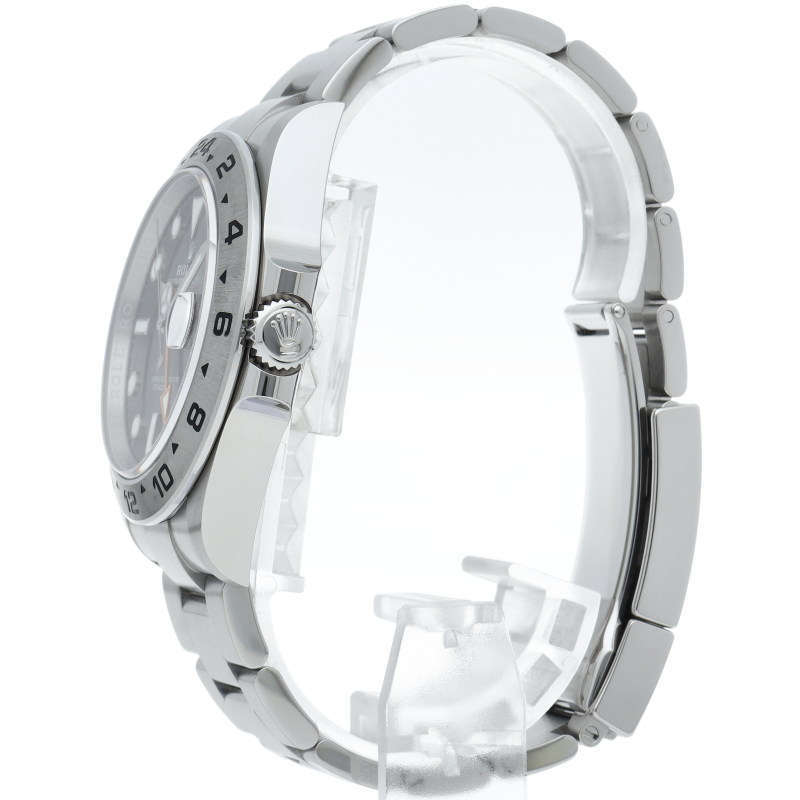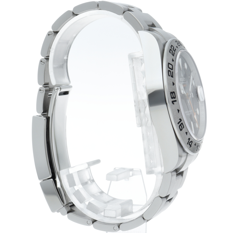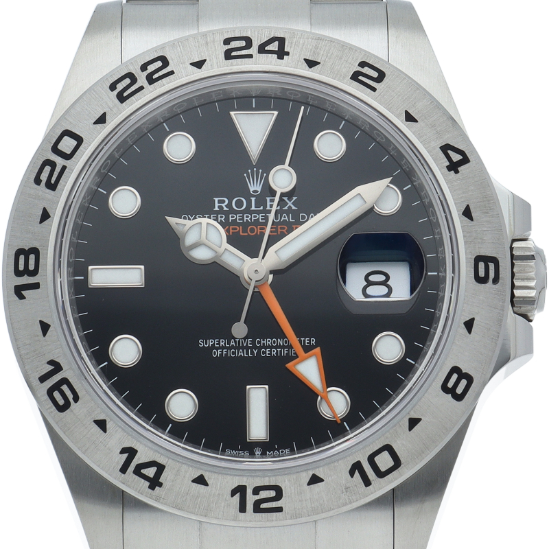 2021年に発表された216570の後継機、226570 オイスターパーペチュアル エクスプローラーII。文字盤中央から伸びるオレンジカラーのGMT針と24時間スケールが刻まれたベゼルを用いて第二時間帯も確認可能な探検家、登山家の為のプロフェッショナルウォッチです。