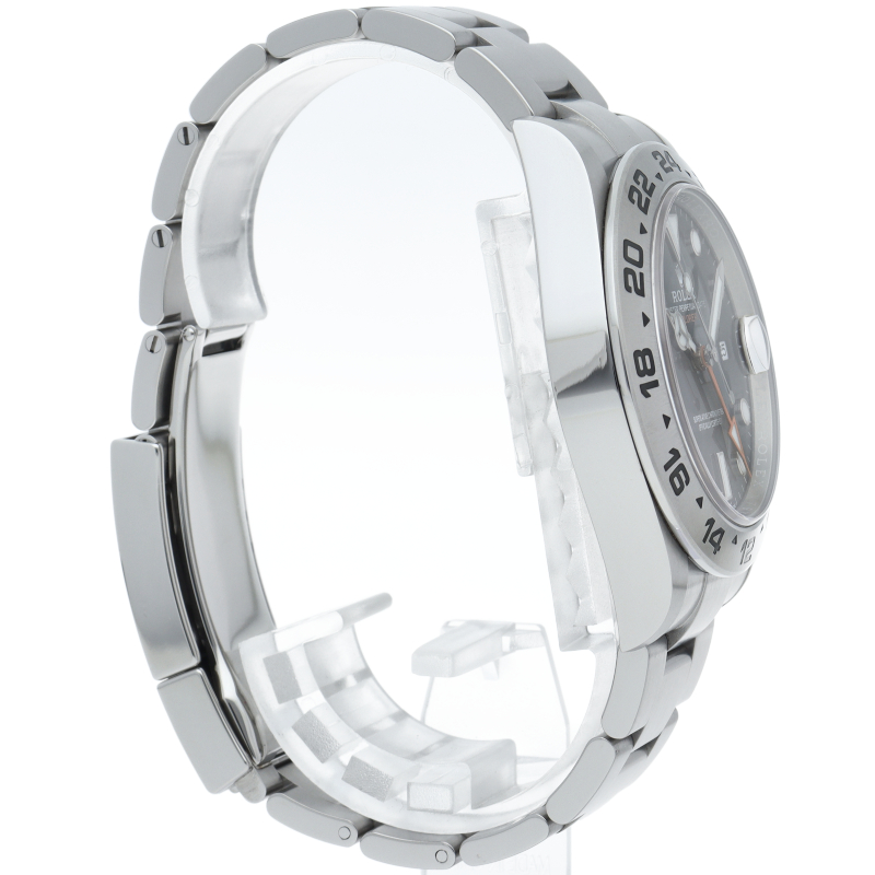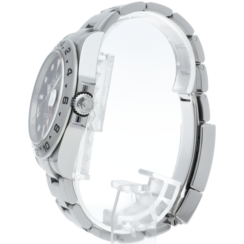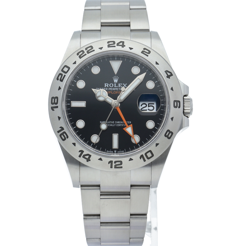 2021年に発表された216570の後継機、226570 オイスターパーペチュアル エクスプローラーII。文字盤中央から伸びるオレンジカラーのGMT針と24時間スケールが刻まれたベゼルを用いて第二時間帯も確認可能な探検家、登山家の為のプロフェッショナルウォッチです。