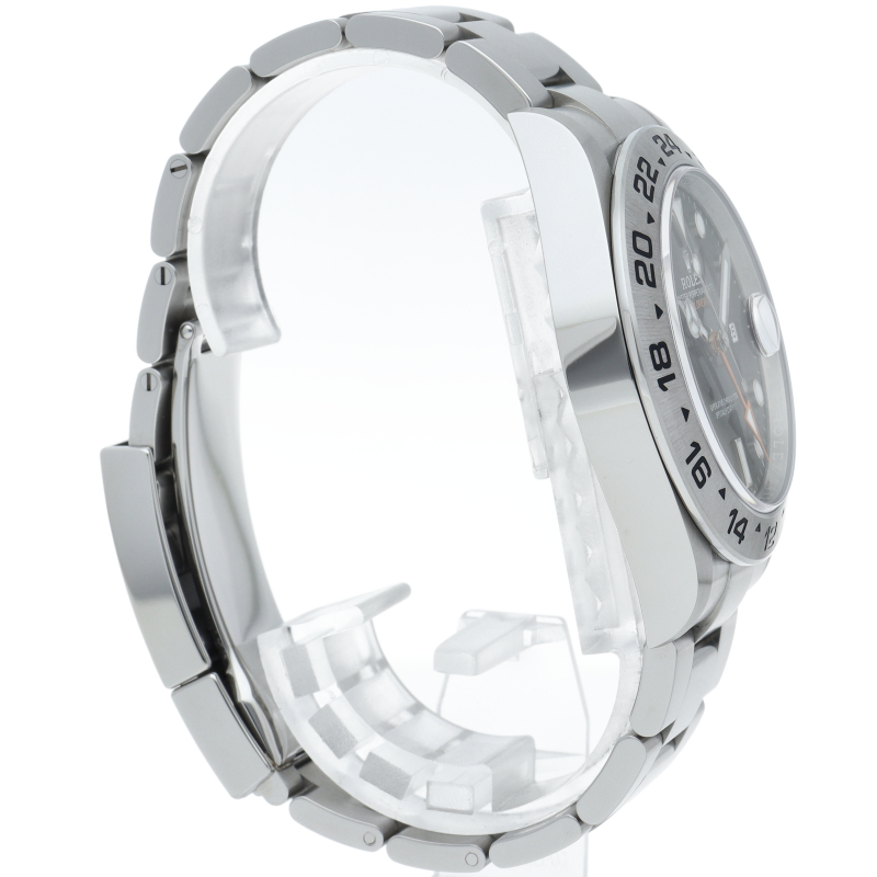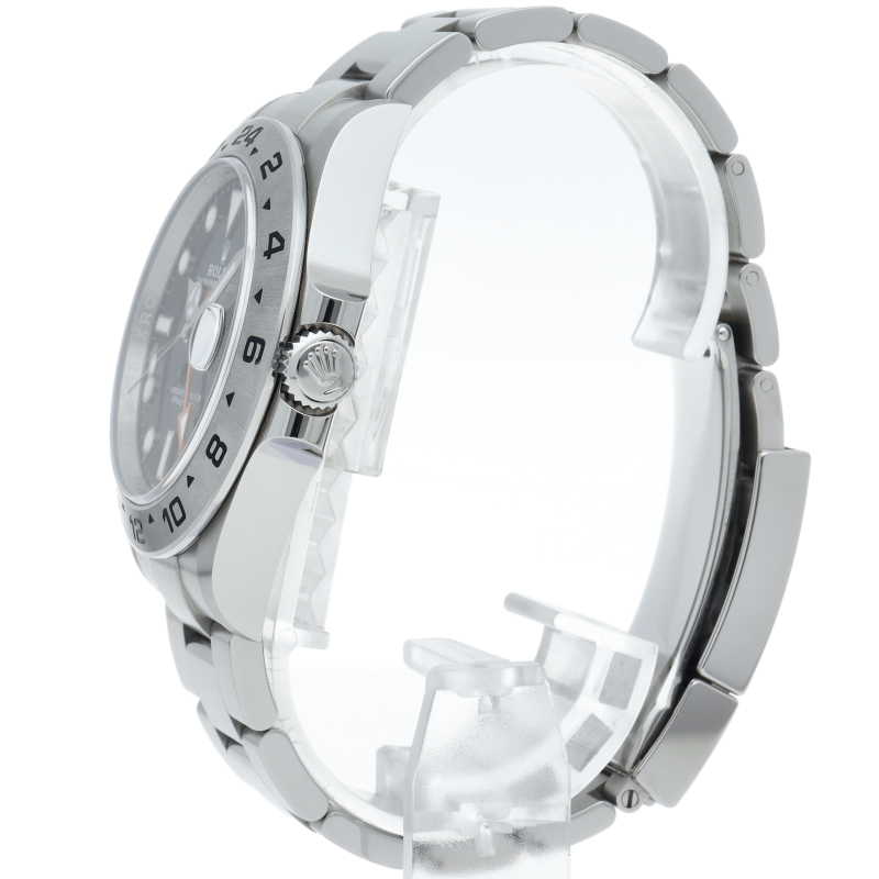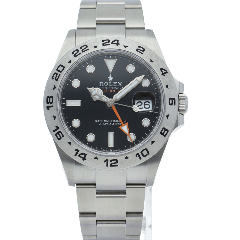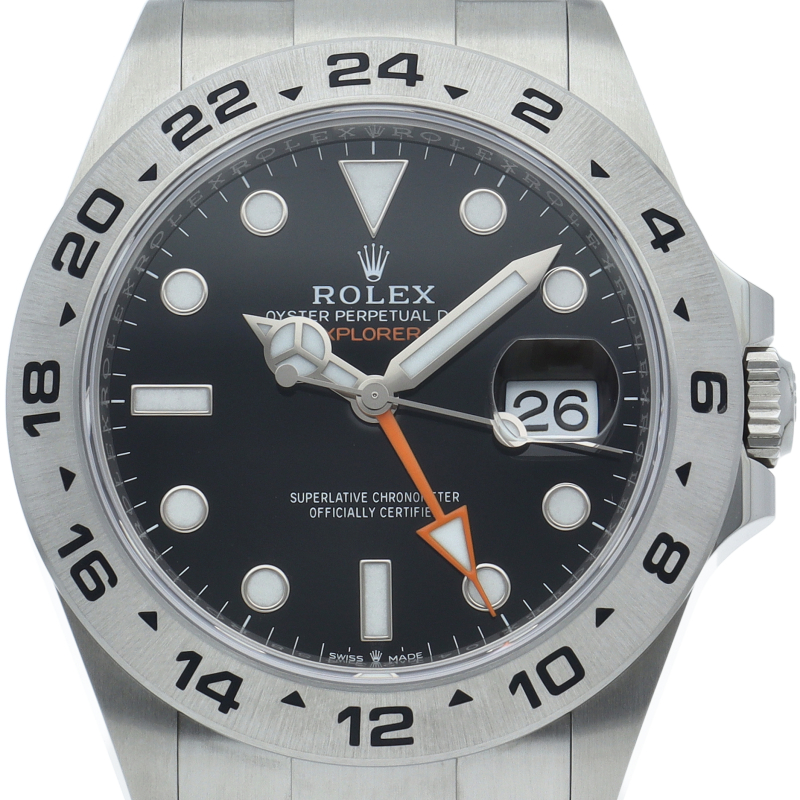2021年に発表された216570の後継機、226570 オイスターパーペチュアル エクスプローラーII。文字盤中央から伸びるオレンジカラーのGMT針と24時間スケールが刻まれたベゼルを用いて第二時間帯も確認可能な探検家、登山家の為のプロフェッショナルウォッチです。