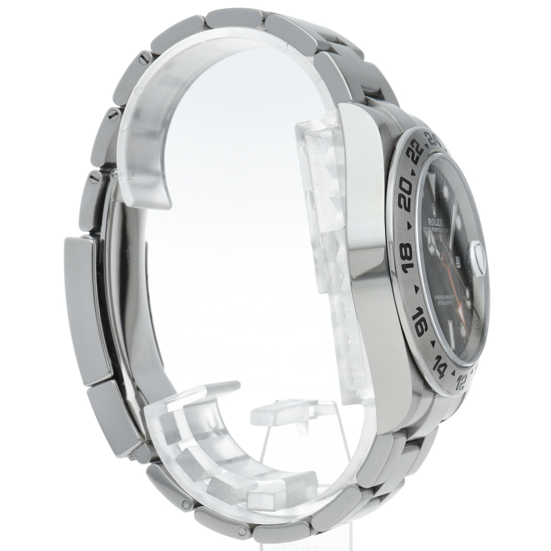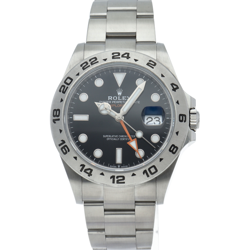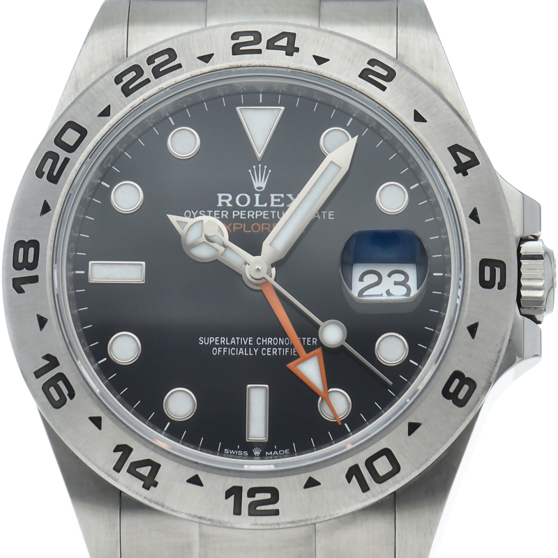 2021年に発表された216570の後継機、226570 オイスターパーペチュアル エクスプローラーII。文字盤中央から伸びるオレンジカラーのGMT針と24時間スケールが刻まれたベゼルを用いて第二時間帯も確認可能な探検家、登山家の為のプロフェッショナルウォッチです。