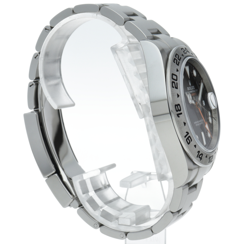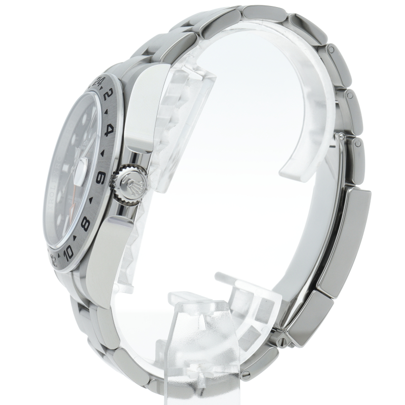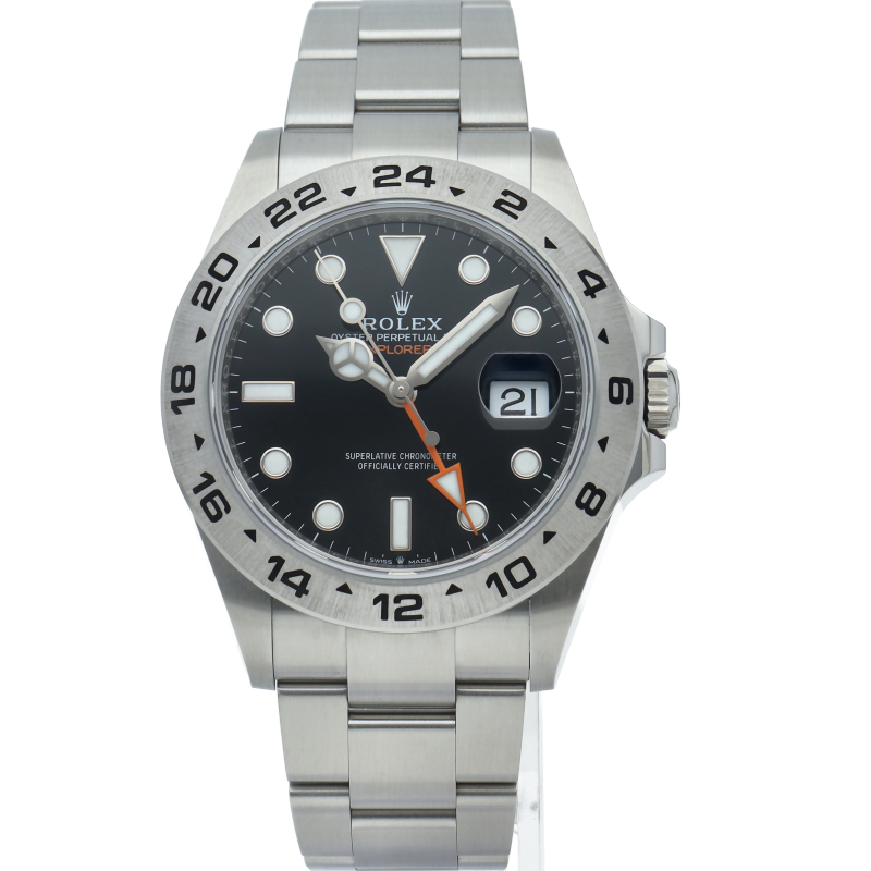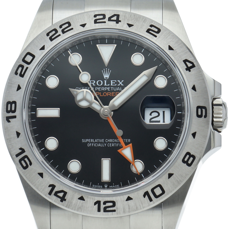 2021年に発表された216570の後継機、226570 オイスターパーペチュアル エクスプローラーII。文字盤中央から伸びるオレンジカラーのGMT針と24時間スケールが刻まれたベゼルを用いて第二時間帯も確認可能な探検家、登山家の為のプロフェッショナルウォッチです。