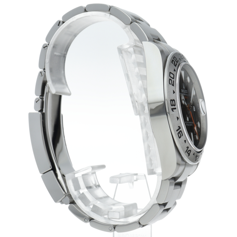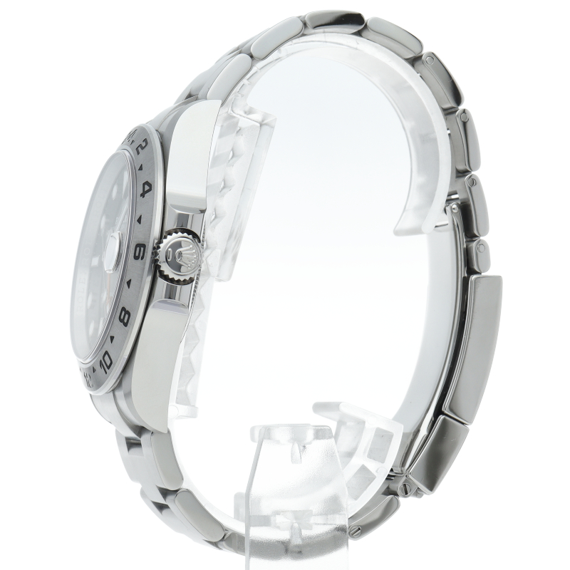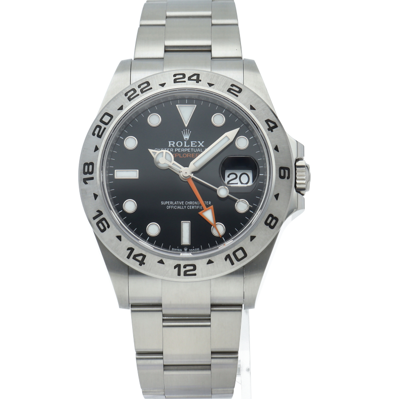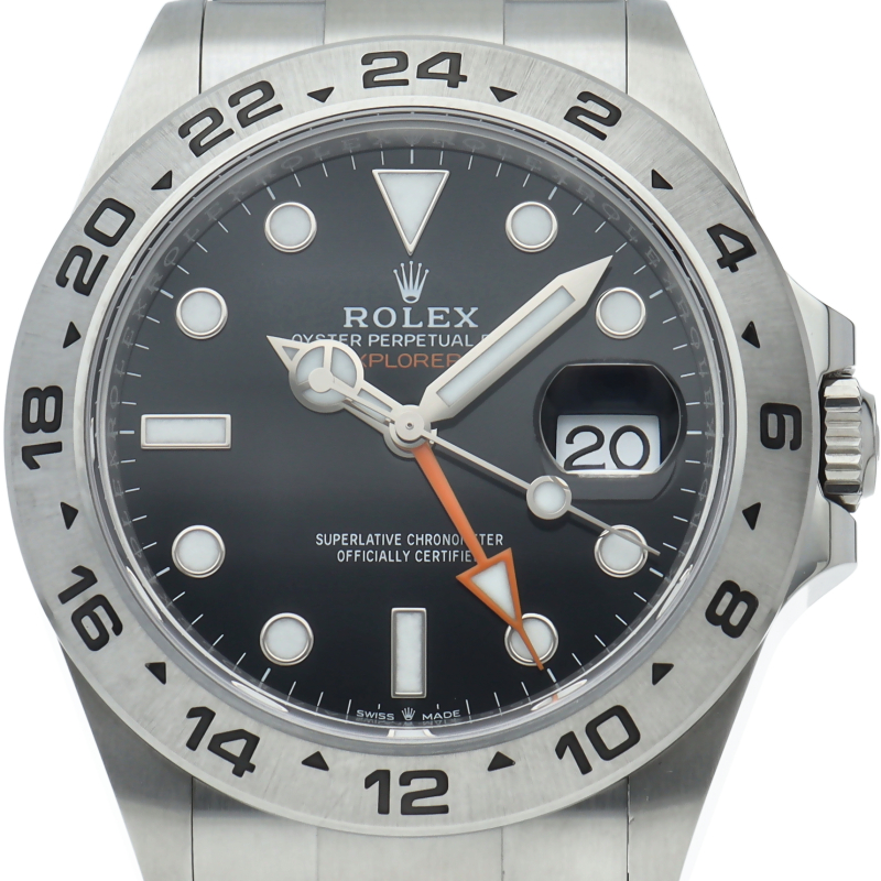 2021年に発表された216570の後継機、226570 オイスターパーペチュアル エクスプローラーII。文字盤中央から伸びるオレンジカラーのGMT針と24時間スケールが刻まれたベゼルを用いて第二時間帯も確認可能な探検家、登山家の為のプロフェッショナルウォッチです。