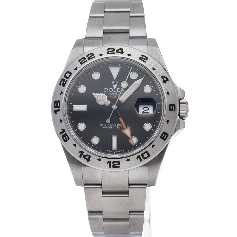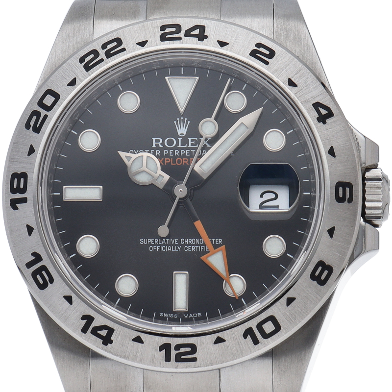2011年にバーゼルで発表された「エクスプローラー2」。ケースサイズは42ミリにアップされ初代エクスプローラー2を思わせる24時間オレンジ針が特徴的な1本。すでに生産終了にともない相場が楽しみな1本です。