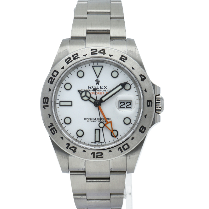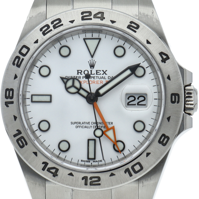 2011年にバーゼルで発表された「エクスプローラー2」。ケースサイズは42ミリにアップされ初代エクスプローラー2を思わせる24時間オレンジ針が特徴的な1本。すでに生産終了にともない相場が楽しみな1本です。