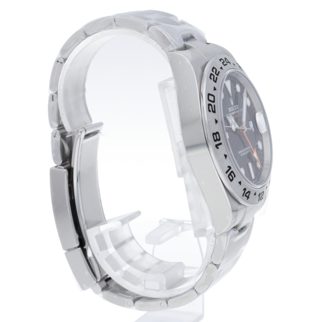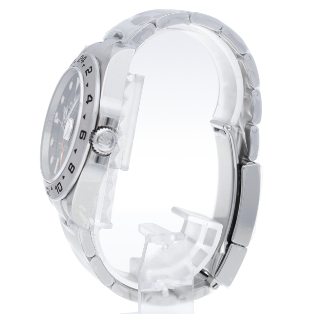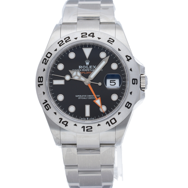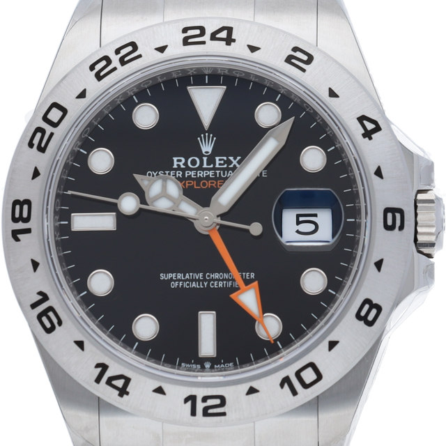 2021年に発表された216570の後継機、【226570 オイスターパーペチュアル エクスプローラーⅡ】。文字盤中央から伸びるオレンジカラーのGMT針と24時間スケールが刻まれたベゼルを用いて第二時間帯も確認可能な探検家、登山家の為のプロフェッショナルウォッチです。