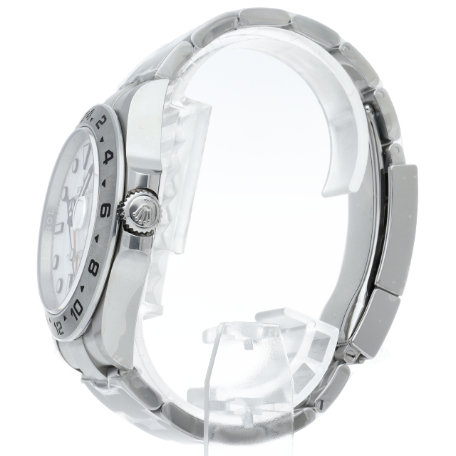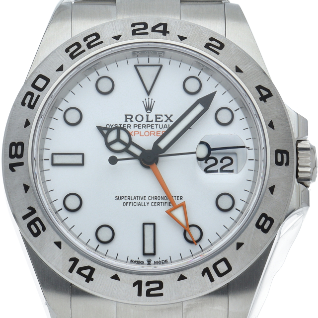 2021年に発表された216570の後継機、【226570 オイスターパーペチュアル エクスプローラーⅡ。文字盤中央から伸びるオレンジカラーのGMT針と24時間スケールが刻まれたベゼルを用いて第二時間帯も確認可能な探検家、登山家の為のプロフェッショナルウォッチです。