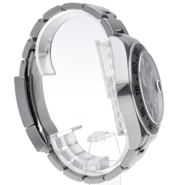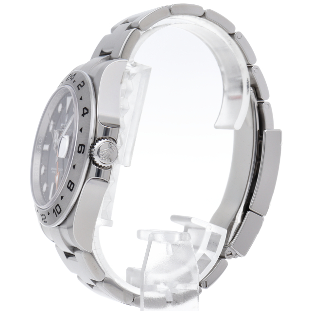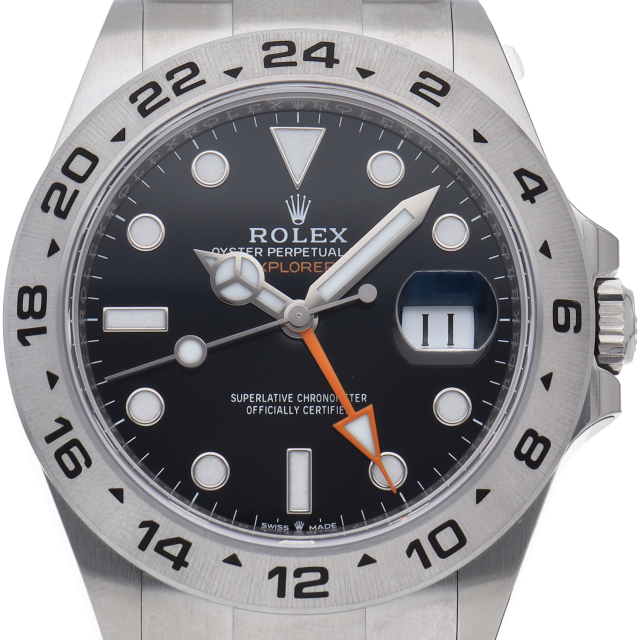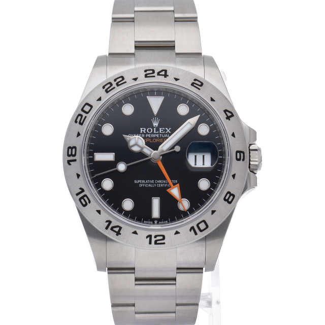 2021年に発表された216570の後継機、226570 オイスターパーペチュアル エクスプローラーⅡ。文字盤中央から伸びるオレンジカラーのGMT針と24時間スケールが刻まれたベゼルを用いて第二時間帯も確認可能な探検家、登山家の為のプロフェッショナルウォッチです。
