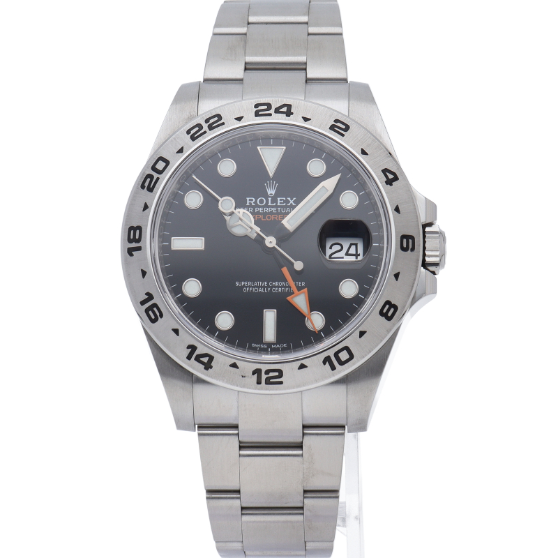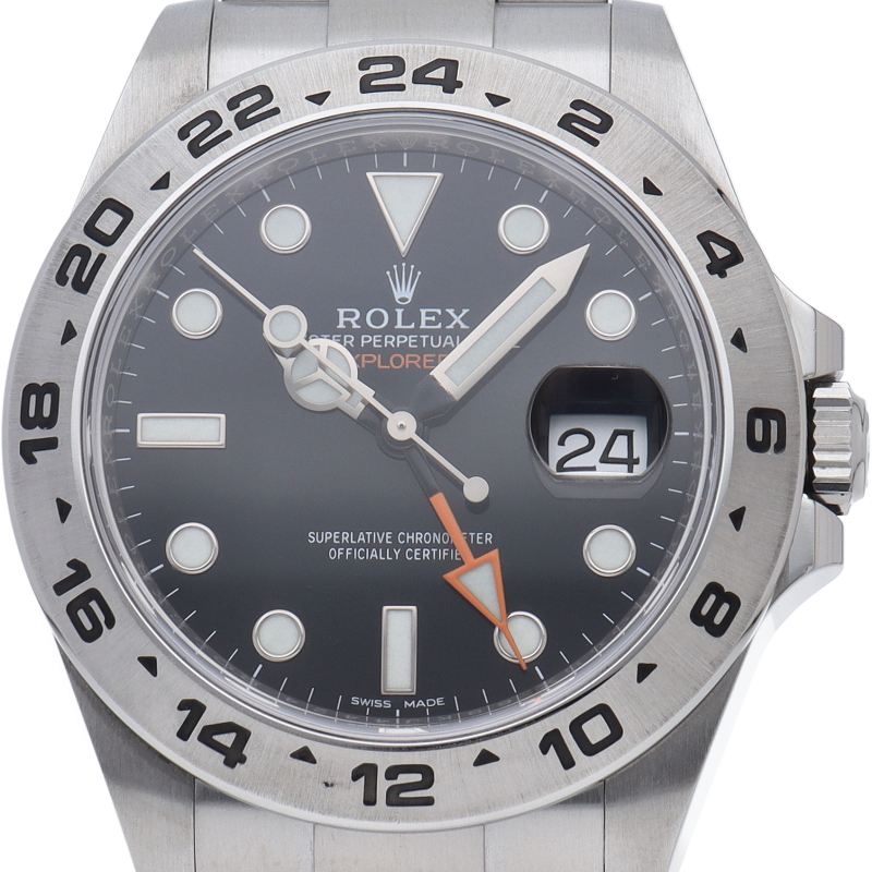 2011年にバーゼルで発表された「エクスプローラー2」。ケースサイズは42ミリにアップされ初代エクスプローラー2を思わせる24時間オレンジ針が特徴的な1本。すでに生産終了にともない相場が楽しみな1本です。