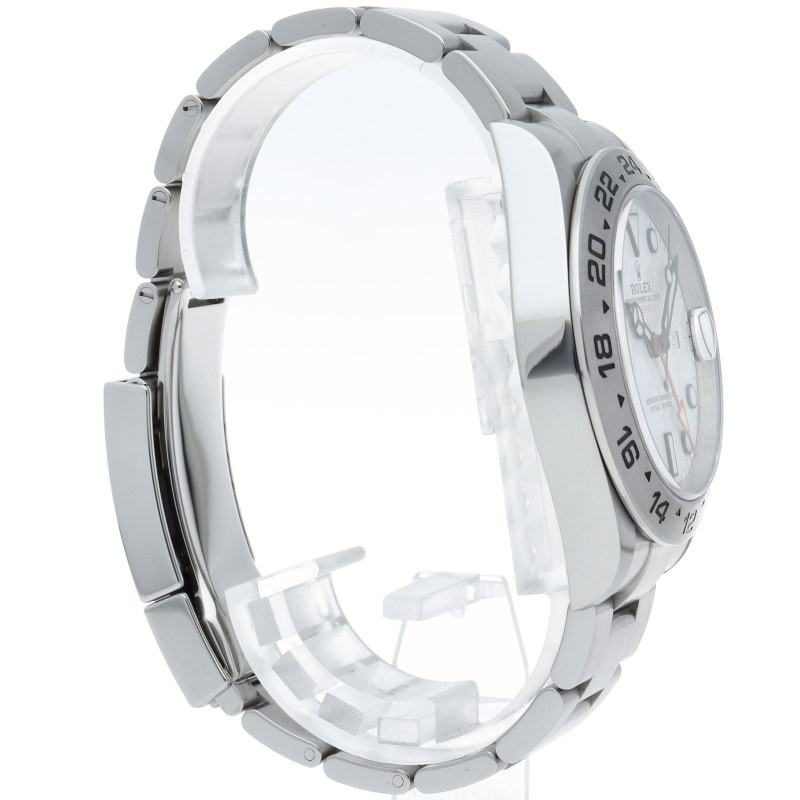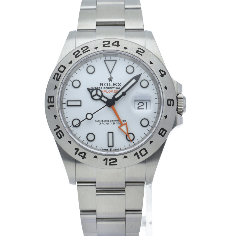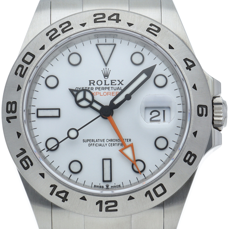 2021年に発表された216570の後継機、【226570 オイスターパーペチュアル エクスプローラーII。文字盤中央から伸びるオレンジカラーのGMT針と24時間スケールが刻まれたベゼルを用いて第二時間帯も確認可能な探検家、登山家の為のプロフェッショナルウォッチです。