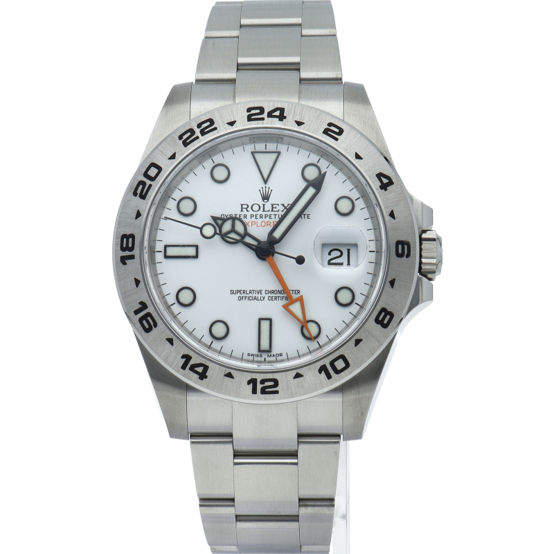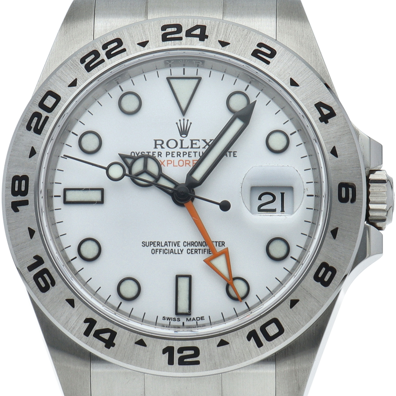2011年にバーゼルで発表された「エクスプローラー2」。ケースサイズは42ミリにアップされ初代エクスプローラー2を思わせる24時間オレンジ針が特徴的な1本。すでに生産終了にともない相場が楽しみな1本です。