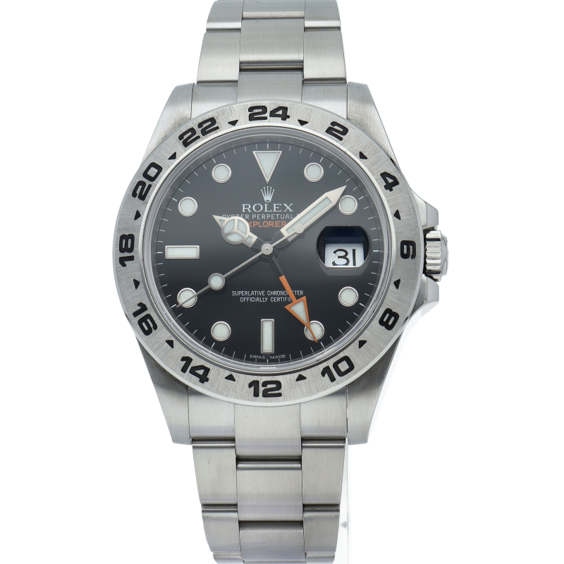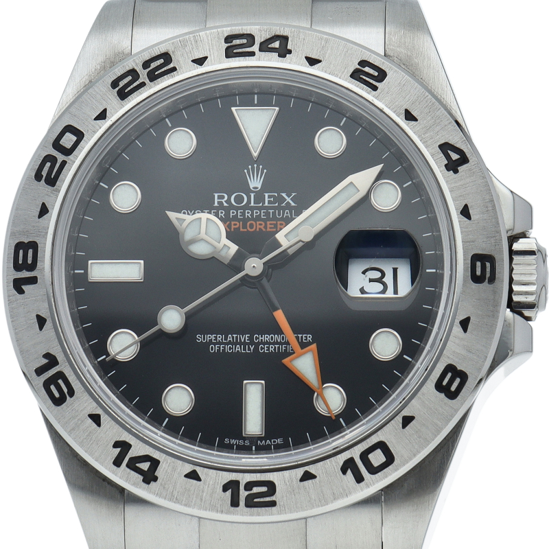 2011年にバーゼルで発表された「エクスプローラー2」。ケースサイズは42ミリにアップされ初代エクスプローラー2を思わせる24時間オレンジ針が特徴的な1本。すでに生産終了にともない相場が楽しみな1本です。