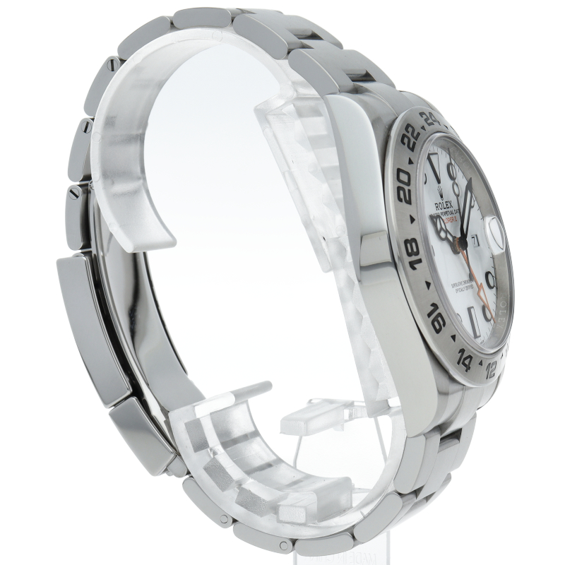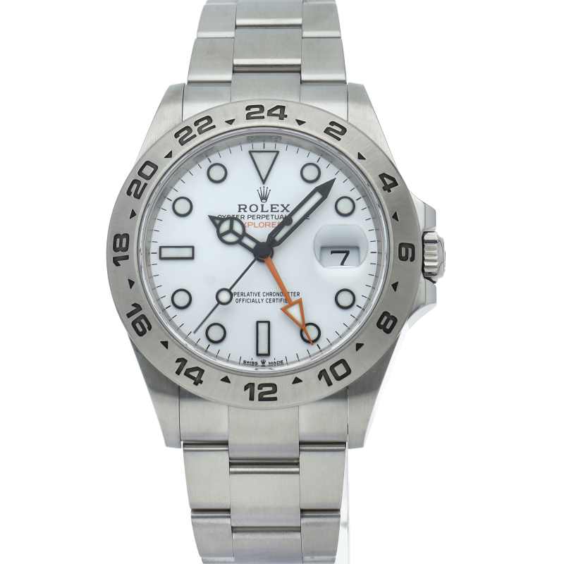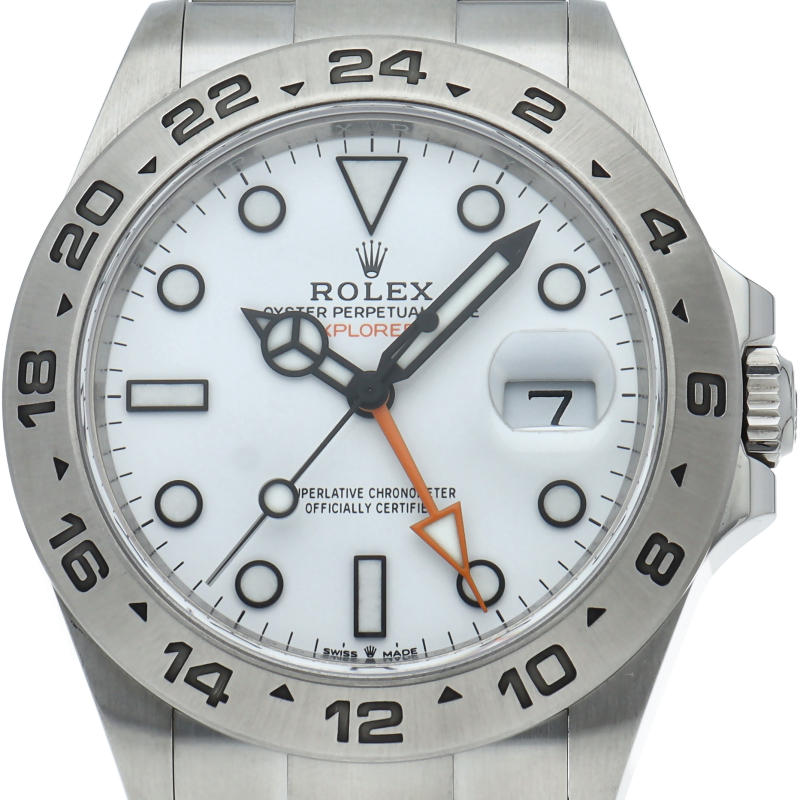2021年に発表された216570の後継機、226570 オイスターパーペチュアル エクスプローラーII。文字盤中央から伸びるオレンジカラーのGMT針と24時間スケールが刻まれたベゼルを用いて第二時間帯も確認可能な探検家、登山家の為のプロフェッショナルウォッチです。