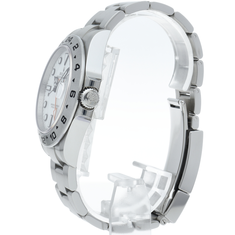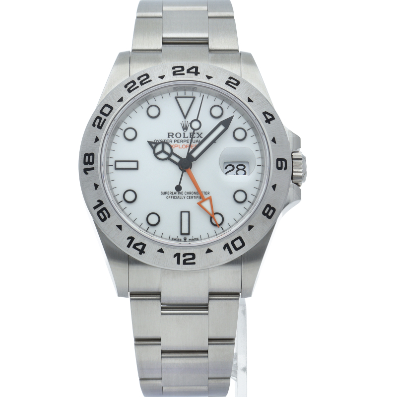 2021年に発表された216570の後継機、【226570 オイスターパーペチュアル エクスプローラーⅡ。文字盤中央から伸びるオレンジカラーのGMT針と24時間スケールが刻まれたベゼルを用いて第二時間帯も確認可能な探検家、登山家の為のプロフェッショナルウォッチです。