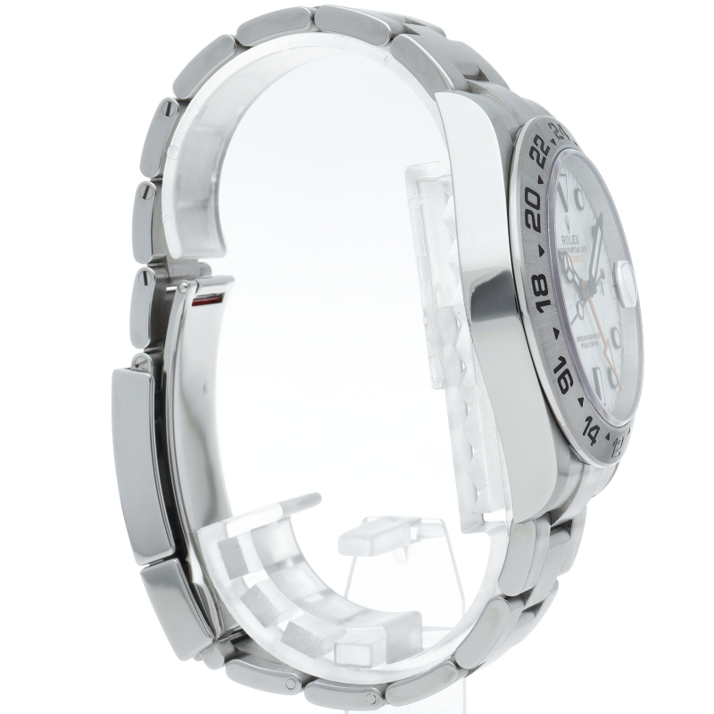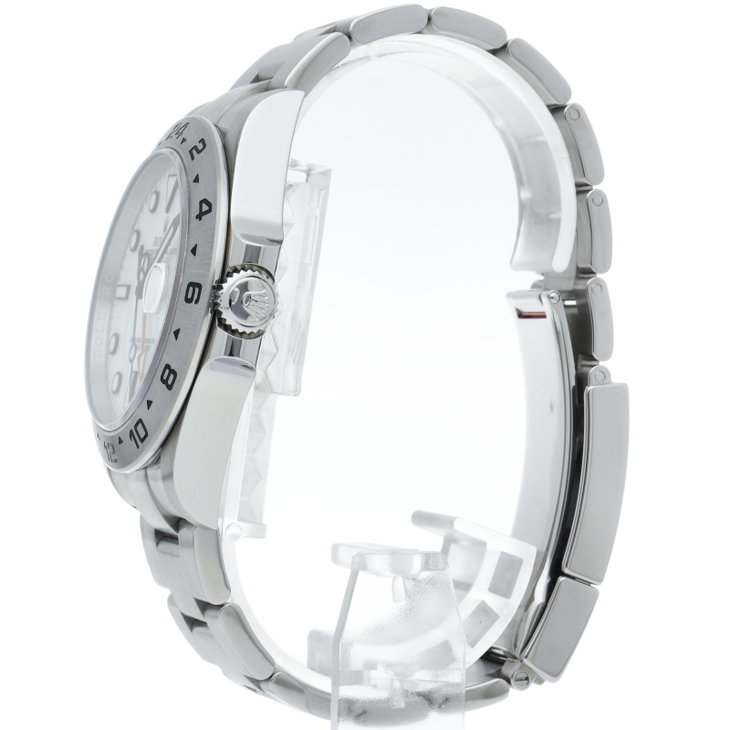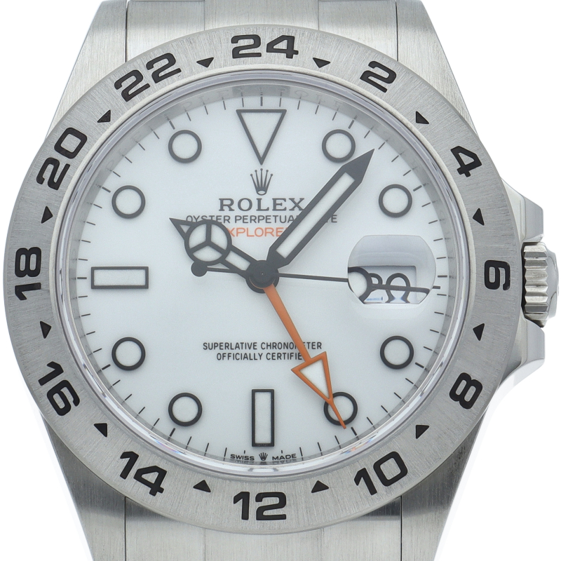 2021年に発表された216570の後継機、【226570 オイスターパーペチュアル エクスプローラーII。文字盤中央から伸びるオレンジカラーのGMT針と24時間スケールが刻まれたベゼルを用いて第二時間帯も確認可能な探検家、登山家の為のプロフェッショナルウォッチです。
