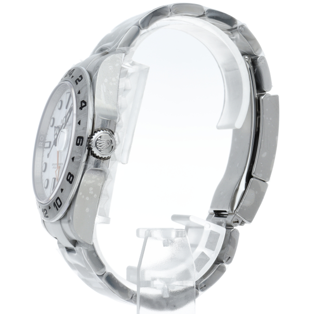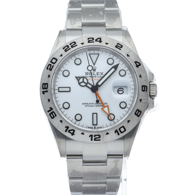 2021年に発表された216570の後継機、【226570 オイスターパーペチュアル エクスプローラーⅡ。文字盤中央から伸びるオレンジカラーのGMT針と24時間スケールが刻まれたベゼルを用いて第二時間帯も確認可能な探検家、登山家の為のプロフェッショナルウォッチです。
