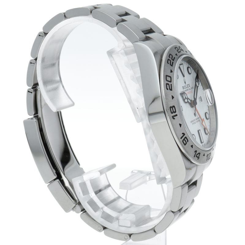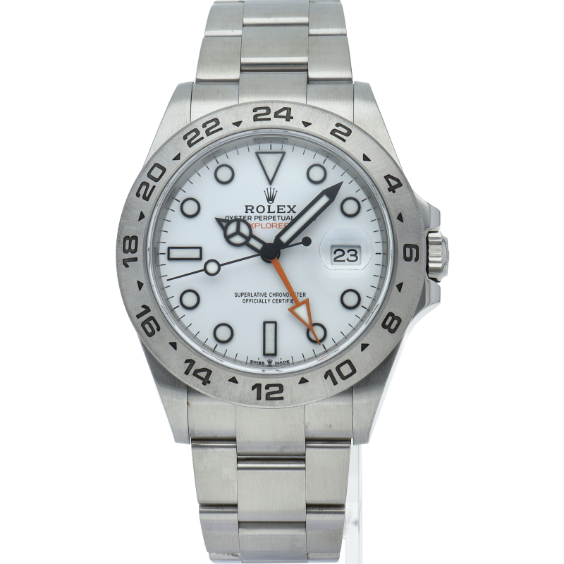 2021年に発表された216570の後継機、【226570 オイスターパーペチュアル エクスプローラーII。文字盤中央から伸びるオレンジカラーのGMT針と24時間スケールが刻まれたベゼルを用いて第二時間帯も確認可能な探検家、登山家の為のプロフェッショナルウォッチです。