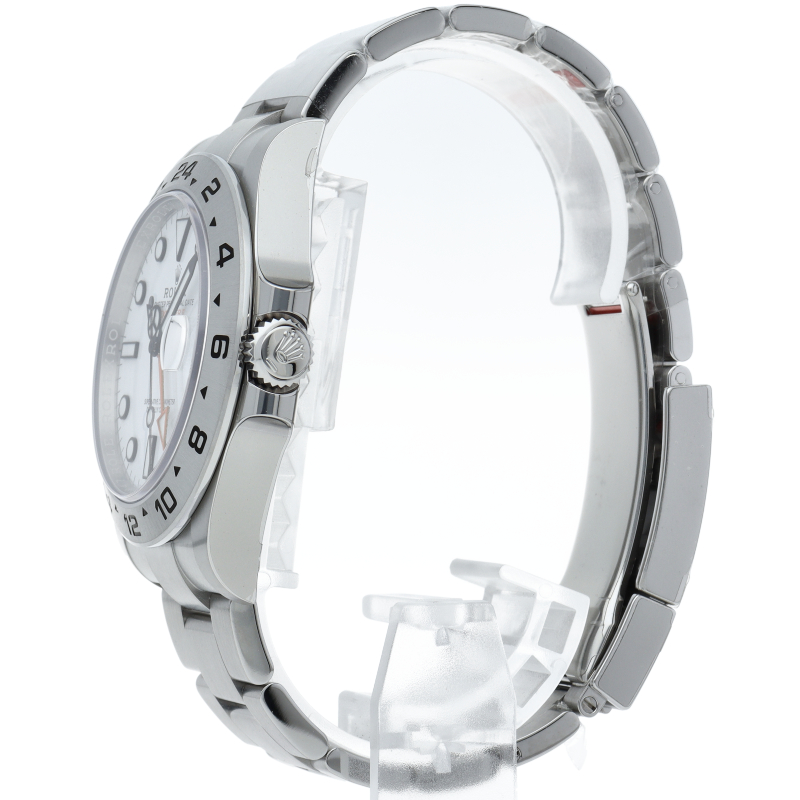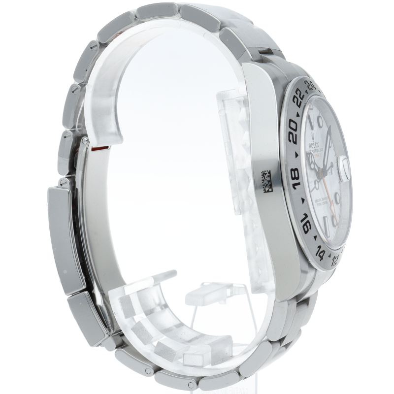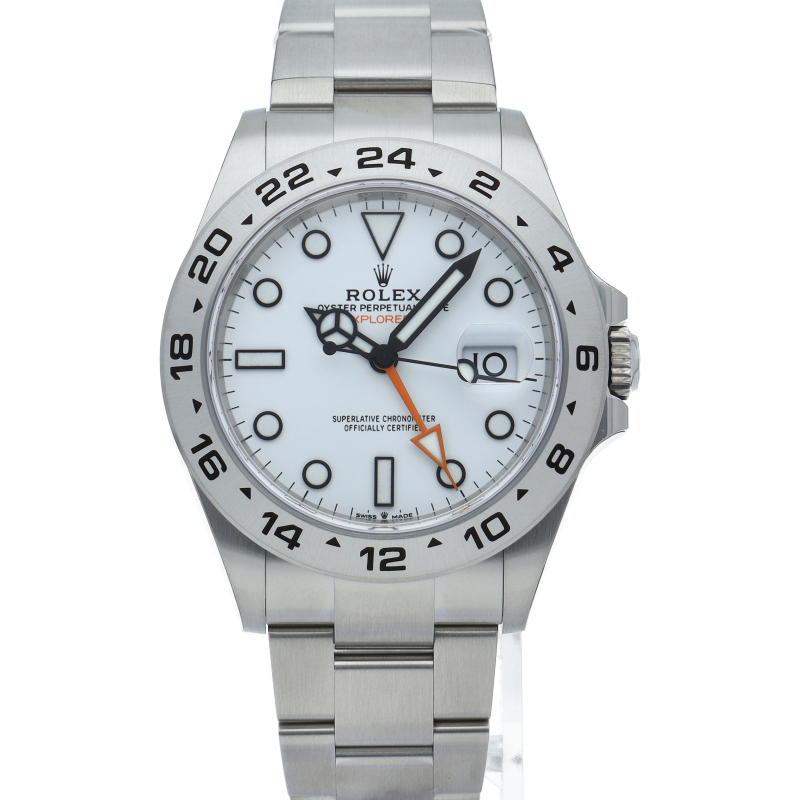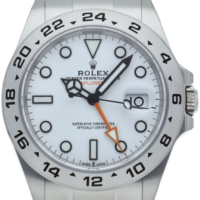 2021年に発表された216570の後継機、【226570 オイスターパーペチュアル エクスプローラーⅡ。文字盤中央から伸びるオレンジカラーのGMT針と24時間スケールが刻まれたベゼルを用いて第二時間帯も確認可能な探検家、登山家の為のプロフェッショナルウォッチです。