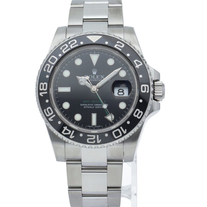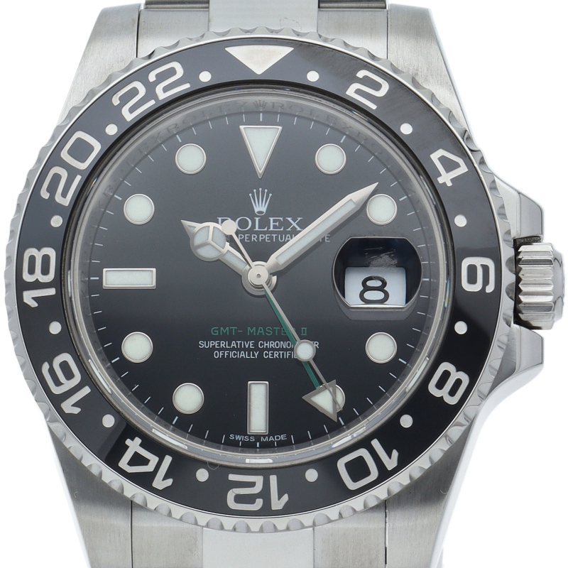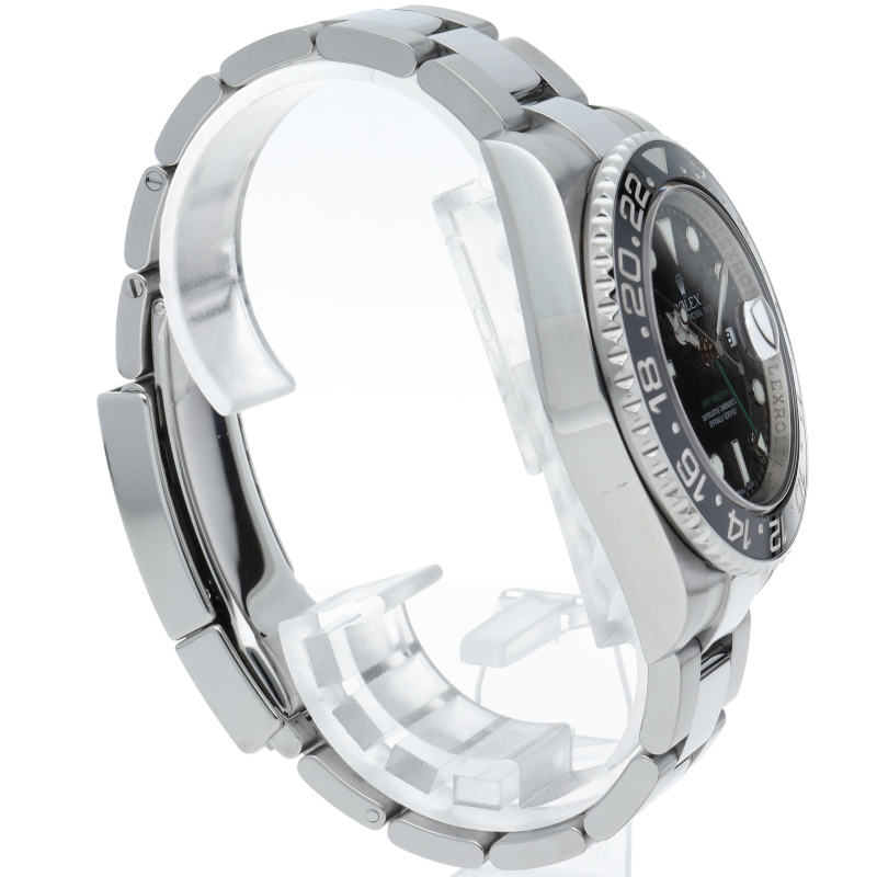 ロレックス人気モデル「GMTマスター2」。2019年に生産が終了となったセラミックの黒ベゼルは実用性はもちろん、これからの相場が楽しみな1本です。