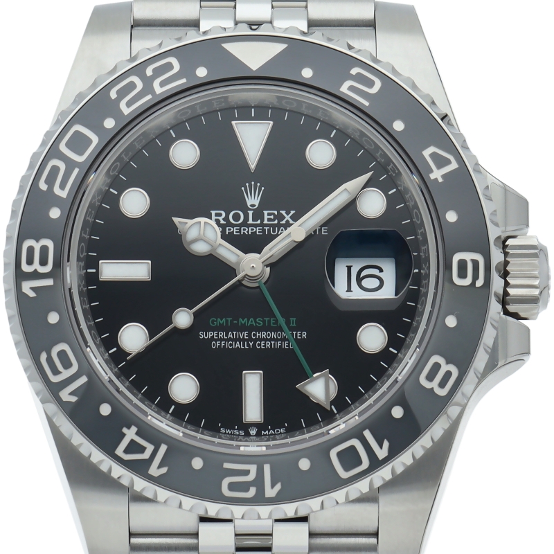 2024年に新たに加わった、グレー/ブラックベゼルにステンレスのケース/オイスターブレスレットの【126710GRNR GMTマスターII】。キャリバー3285はロレックスが特許を取得したクロナジーエスケープメントを採用し、高いエネルギー効率により70時間ものパワーリザーブを誇ります。