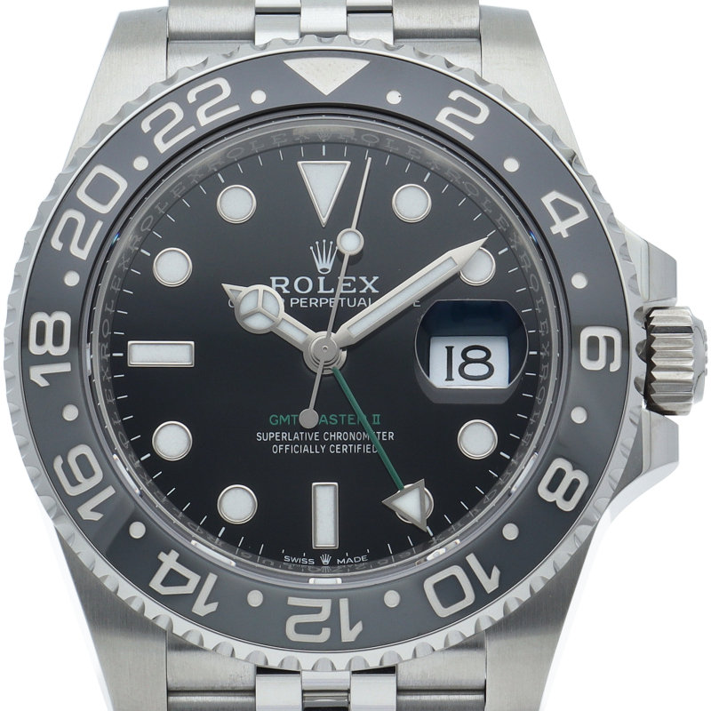 2024年に新たに加わった、グレー/ブラックベゼルにステンレスのケース/オイスターブレスレットの【126710GRNR GMTマスターII】。キャリバー3285はロレックスが特許を取得したクロナジーエスケープメントを採用し、高いエネルギー効率により70時間ものパワーリザーブを誇ります。