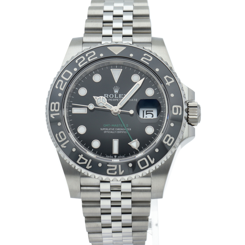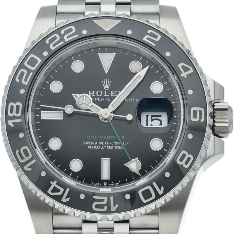 2024年に新たに加わった、グレー/ブラックベゼルにステンレスのケース/オイスターブレスレットの【126710GRNR GMTマスターII】。キャリバー3285はロレックスが特許を取得したクロナジーエスケープメントを採用し、高いエネルギー効率により70時間ものパワーリザーブを誇ります。