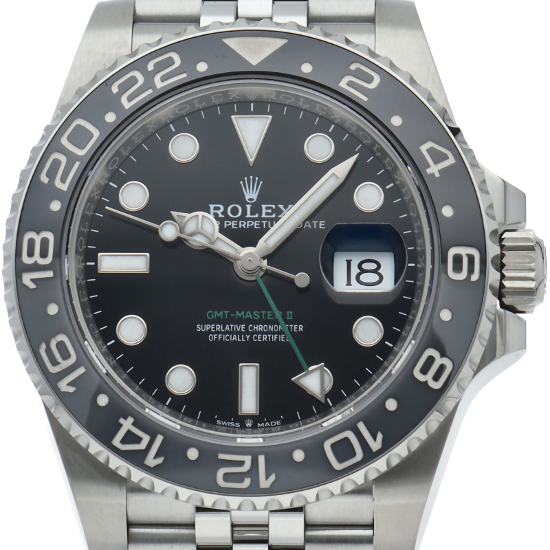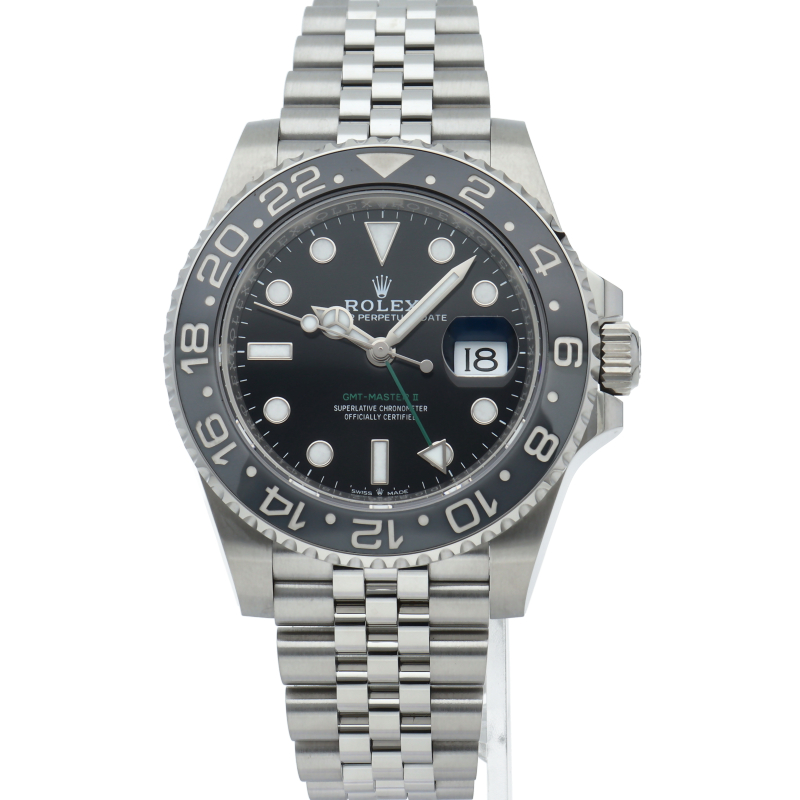 2024年に新たに加わった、グレー/ブラックベゼルにステンレスのケース/オイスターブレスレットの【126710GRNR GMTマスターII】。キャリバー3285はロレックスが特許を取得したクロナジーエスケープメントを採用し、高いエネルギー効率により70時間ものパワーリザーブを誇ります。