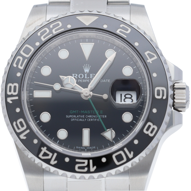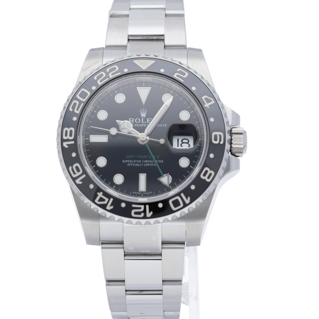 ロレックス人気モデル「GMTマスター2」。2019年に生産が終了となったセラミックの黒ベゼルは実用性はもちろん、これからの相場が楽しみな1本です。