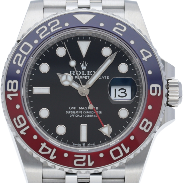 ロレックス人気モデル「GMTマスター2」のモデルチェンジした新型モデルです。セラミックベゼルにブレスやバックルも新しくなり高級感が更に増した1本です。2018年発売モデル。