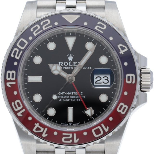 ロレックス人気モデル「GMTマスター2」のモデルチェンジした新型モデルです。セラミックベゼルにブレスやバックルも新しくなり高級感が更に増した1本です。2018年発売モデル。