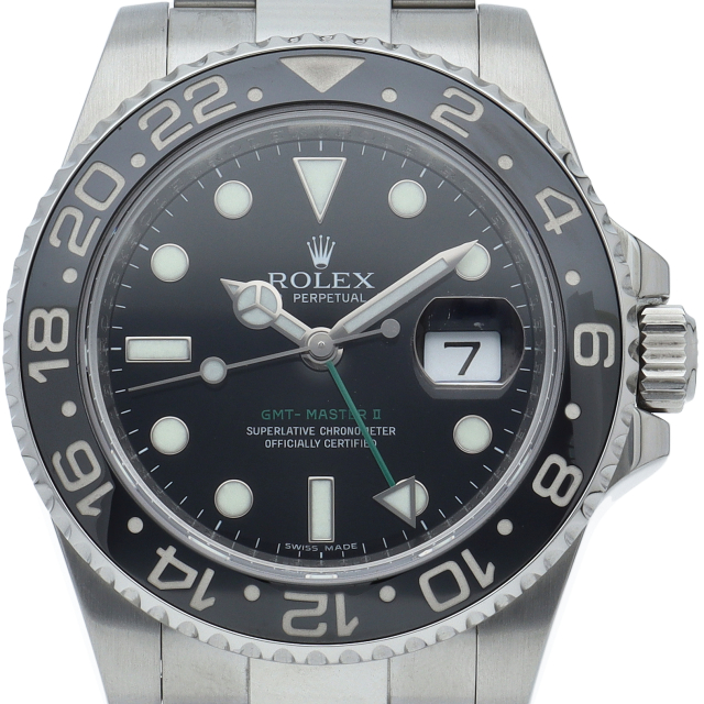 ロレックス人気モデル「GMTマスター2」。2019年に生産が終了となったセラミックの黒ベゼルは実用性はもちろん、これからの相場が楽しみな1本です。