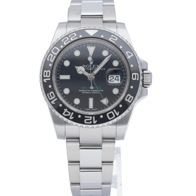 ロレックス人気モデル「GMTマスター2」。2019年に生産が終了となったセラミックの黒ベゼルは実用性はもちろん、これからの相場が楽しみな1本です。