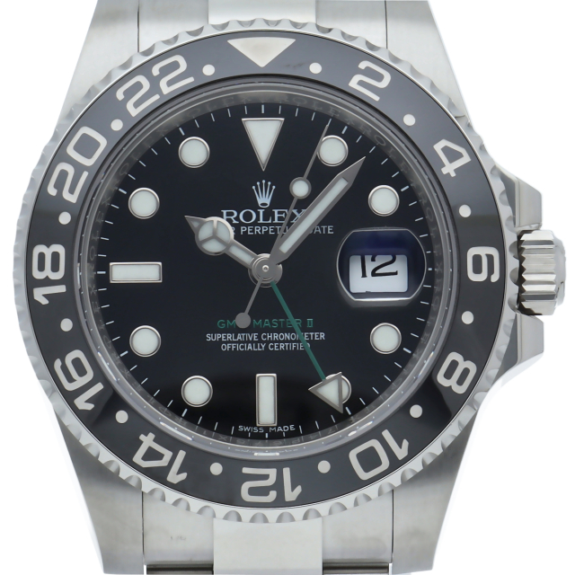 ロレックス人気モデル「GMTマスター2」。2019年に生産が終了となったセラミックの黒ベゼルは実用性はもちろん、これからの相場が楽しみな1本です。