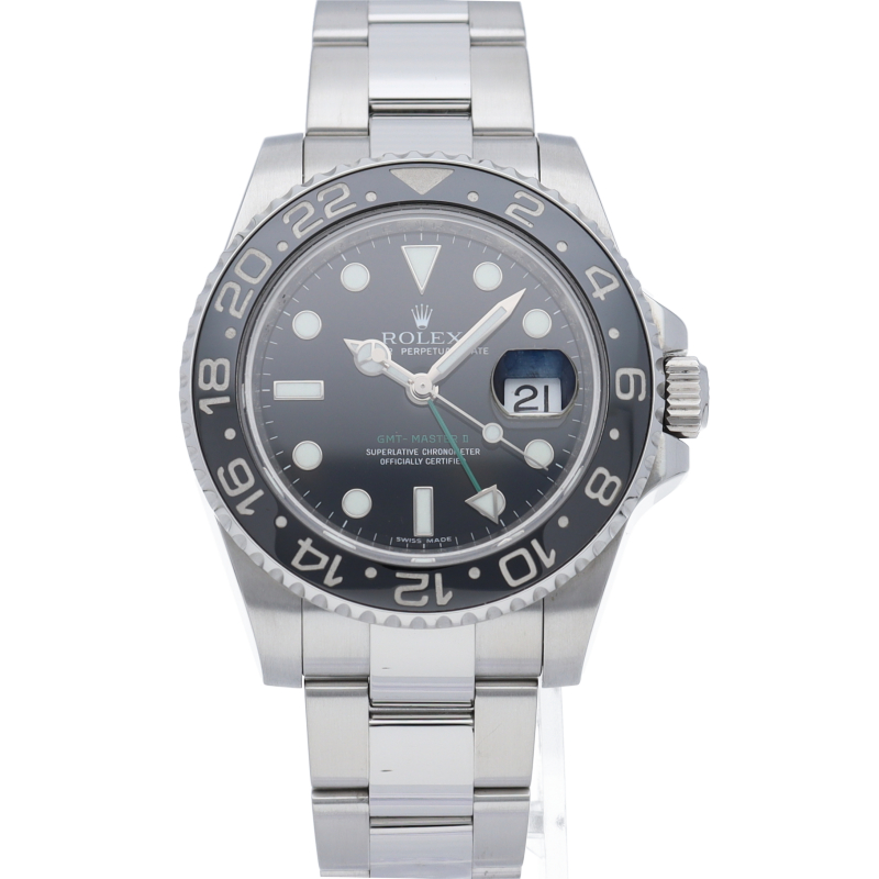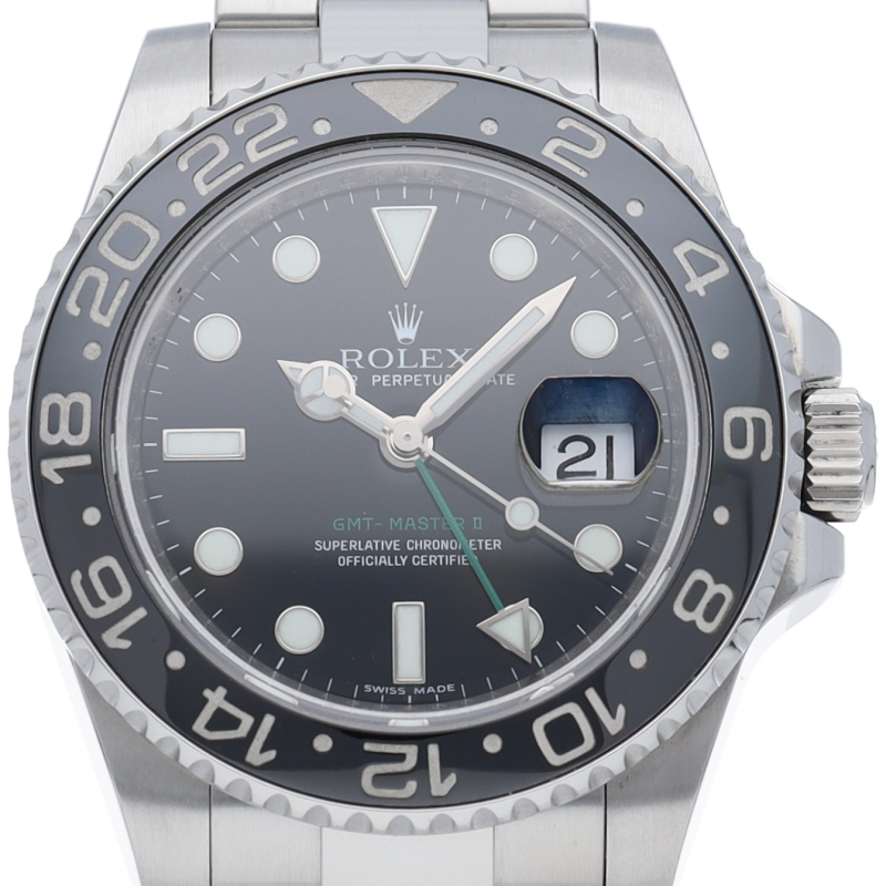 ロレックス人気モデル「GMTマスター2」。2019年に生産が終了となったセラミックの黒ベゼルは実用性はもちろん、これからの相場が楽しみな1本です。