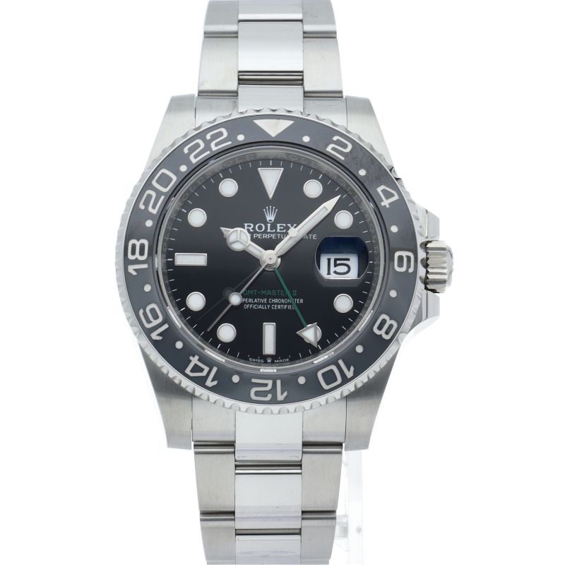 2024年に新たに加わった、グレー/ブラックベゼルにステンレスのケース/オイスターブレスレットの【126710GRNR GMTマスターII】。キャリバー3285はロレックスが特許を取得したクロナジーエスケープメントを採用し、高いエネルギー効率により70時間ものパワーリザーブを誇ります。