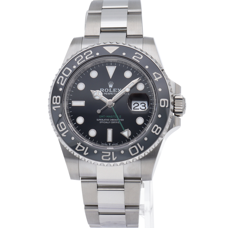 2024年に新たに加わった、グレー/ブラックベゼルにステンレスのケース/オイスターブレスレットの【126710GRNR GMTマスターII】。キャリバー3285はロレックスが特許を取得したクロナジーエスケープメントを採用し、高いエネルギー効率により70時間ものパワーリザーブを誇ります。