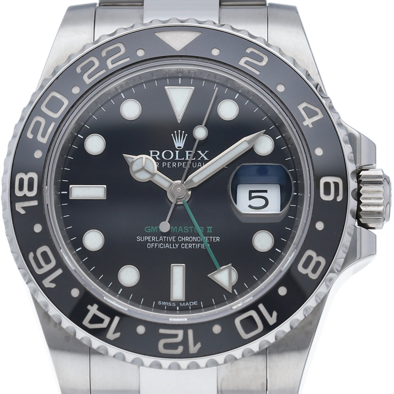 ロレックス人気モデル「GMTマスター2」。2019年に生産が終了となったセラミックの黒ベゼルは実用性はもちろん、これからの相場が楽しみな1本です。