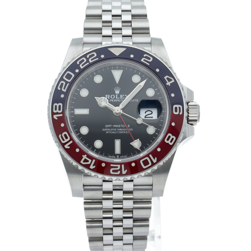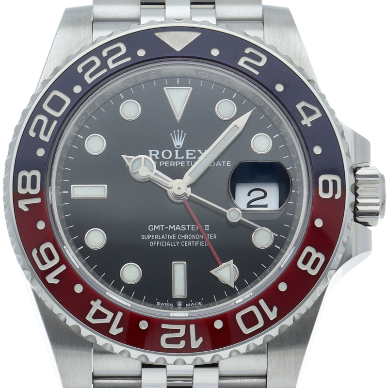 ロレックス人気モデル「GMTマスター2」のモデルチェンジした新型モデルです。セラミックベゼルにブレスやバックルも新しくなり高級感が更に増した1本です。