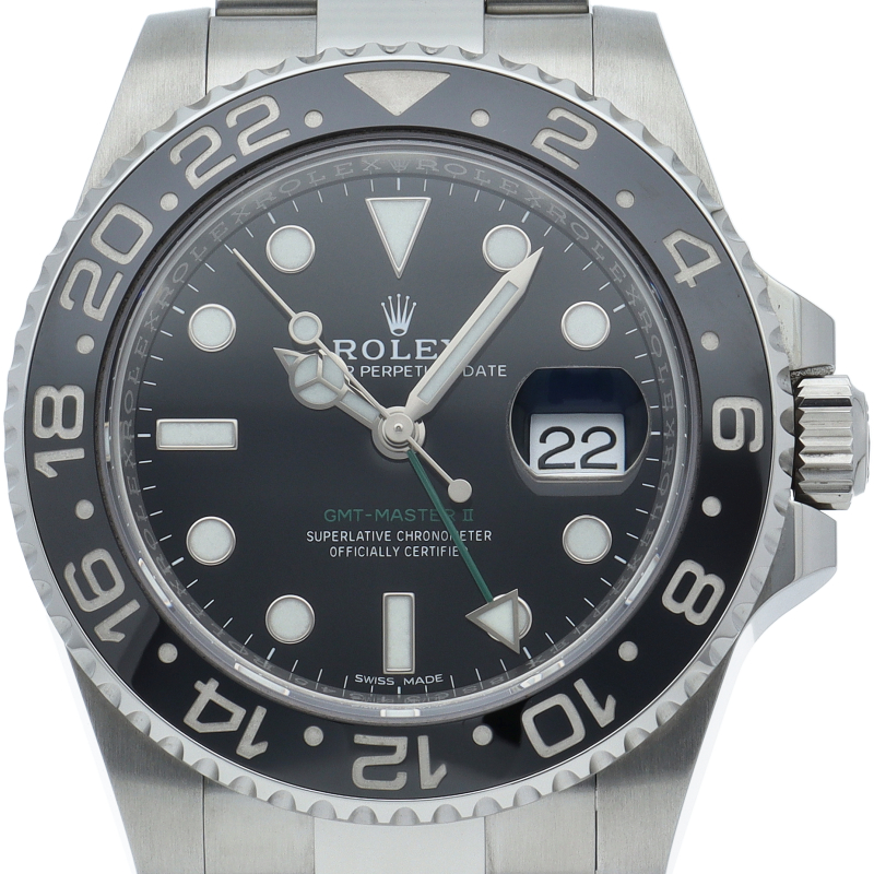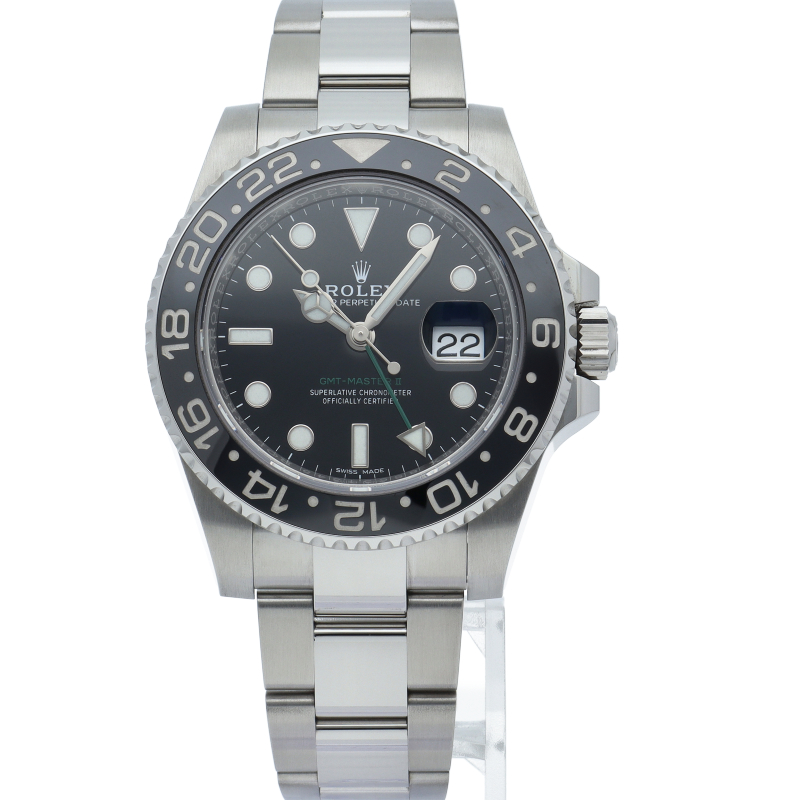 ロレックス人気モデル「GMTマスター2」。2019年に生産が終了となったセラミックの黒ベゼルは実用性はもちろん、これからの相場が楽しみな1本です。