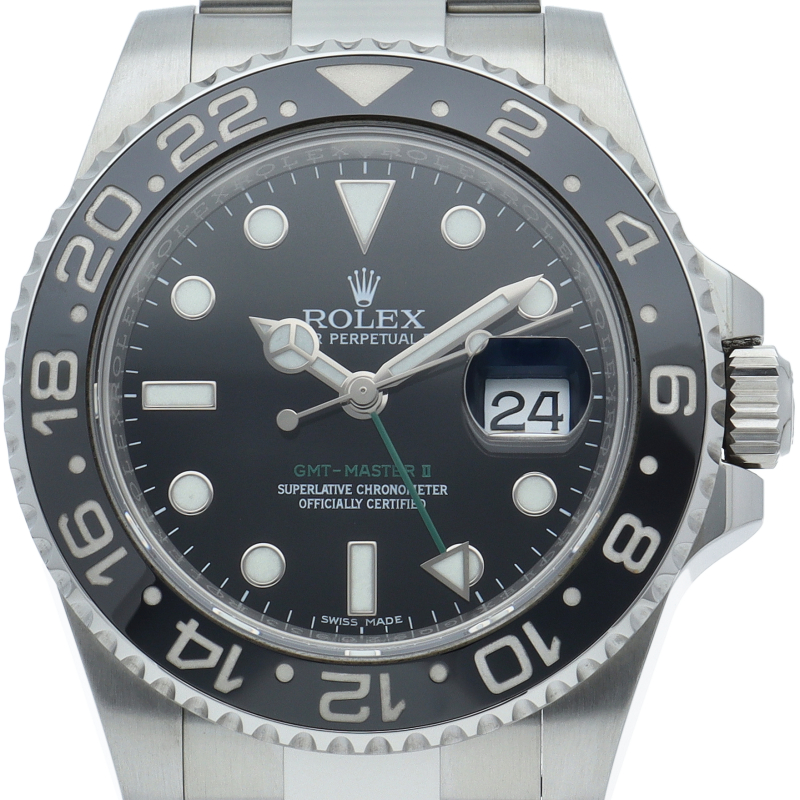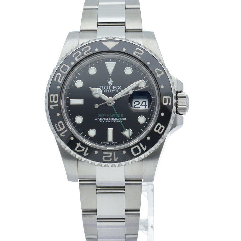 ロレックス人気モデル「GMTマスター2」。2019年に生産が終了となったセラミックの黒ベゼルは実用性はもちろん、これからの相場が楽しみな1本です。