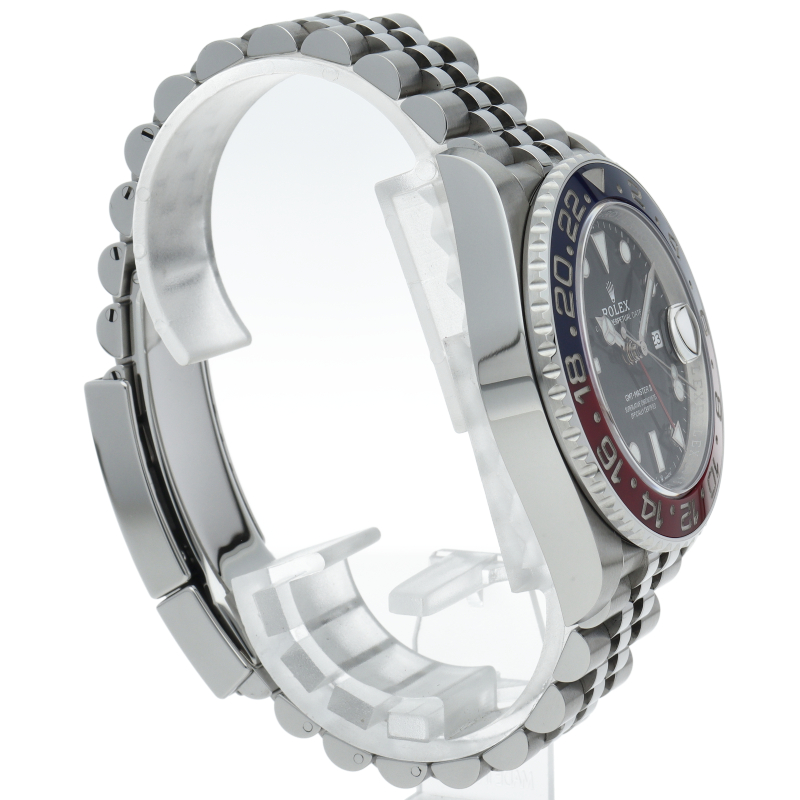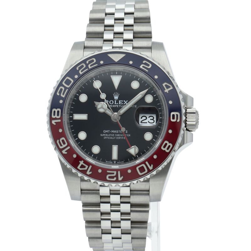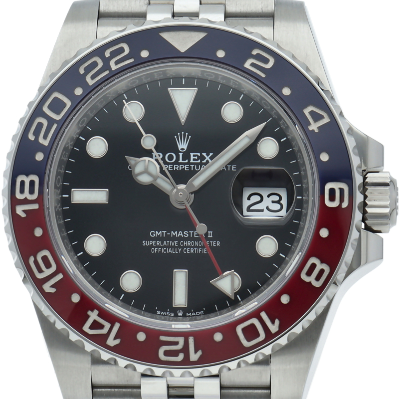 ロレックス人気モデル「GMTマスター2」のモデルチェンジした新型モデルです。セラミックベゼルにブレスやバックルも新しくなり高級感が更に増した1本です。