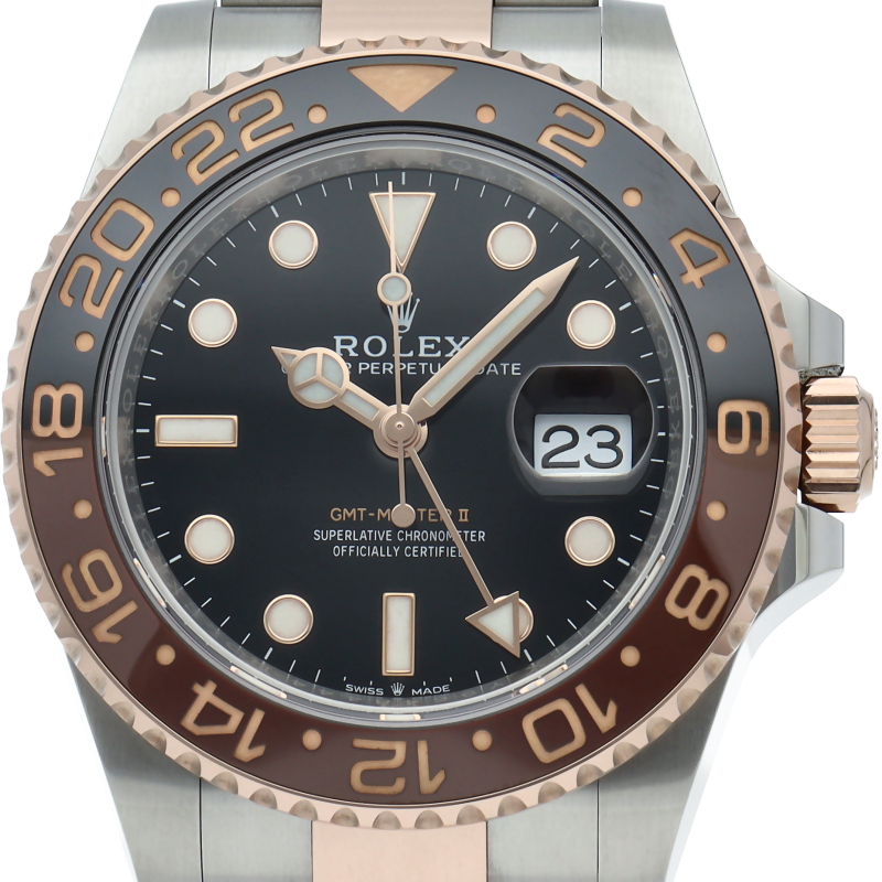 セラクロムベゼルでのGMTマスター2。ロレックスの最新ムーブメント「Cal.3285」を搭載しており、エネルギー効率が最適化されたクロナジー脱進機、テンプを衝撃から守る為の耐震装置パラフレックス ショック・アブソーバそして70時間ものロングパワーリザーブとロレックスの最新技術を駆使したムーブメントになっています。