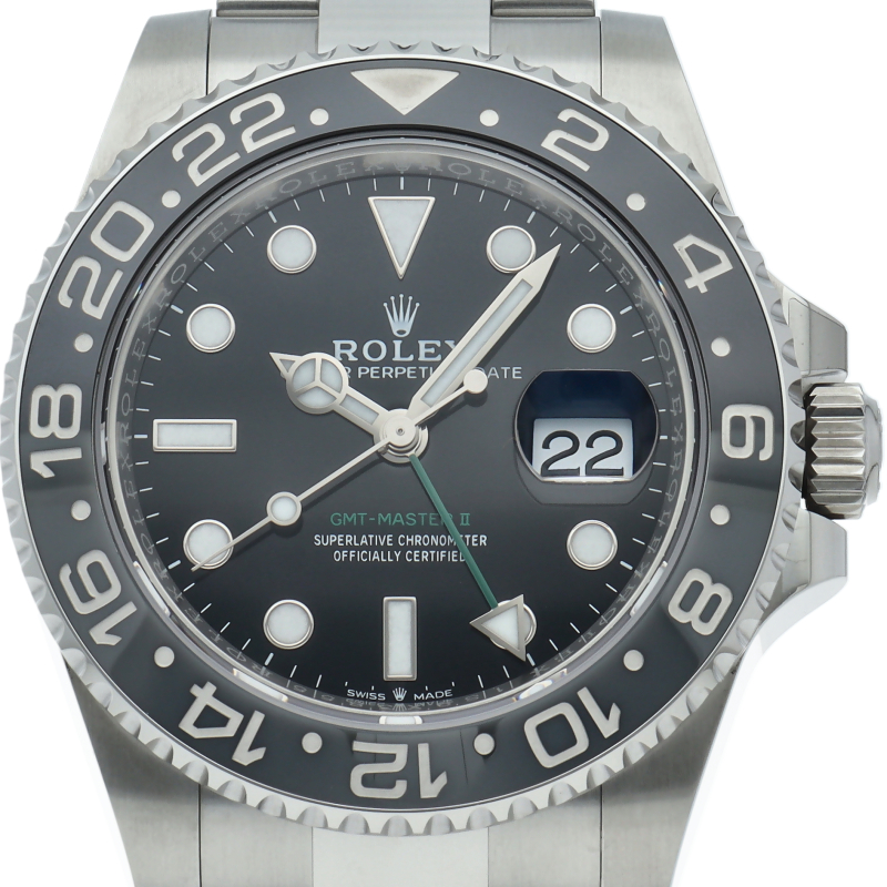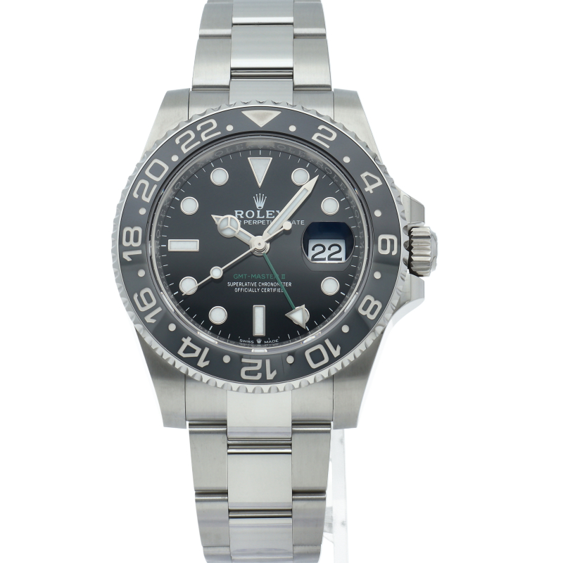 2024年に新たに加わった、グレー/ブラックベゼルにステンレスのケース/オイスターブレスレットの【126710GRNR GMTマスターII】。キャリバー3285はロレックスが特許を取得したクロナジーエスケープメントを採用し、高いエネルギー効率により70時間ものパワーリザーブを誇ります。