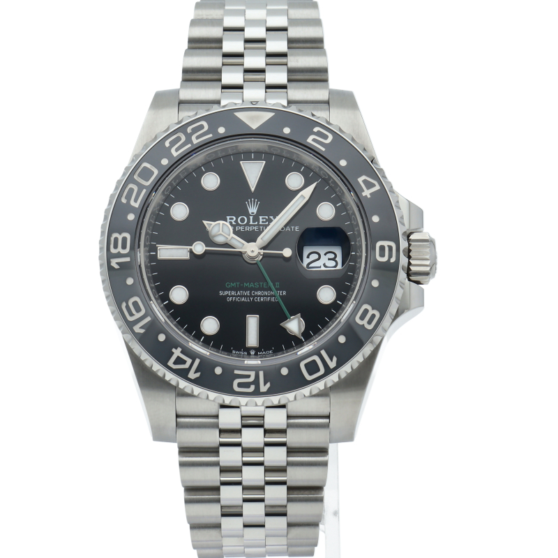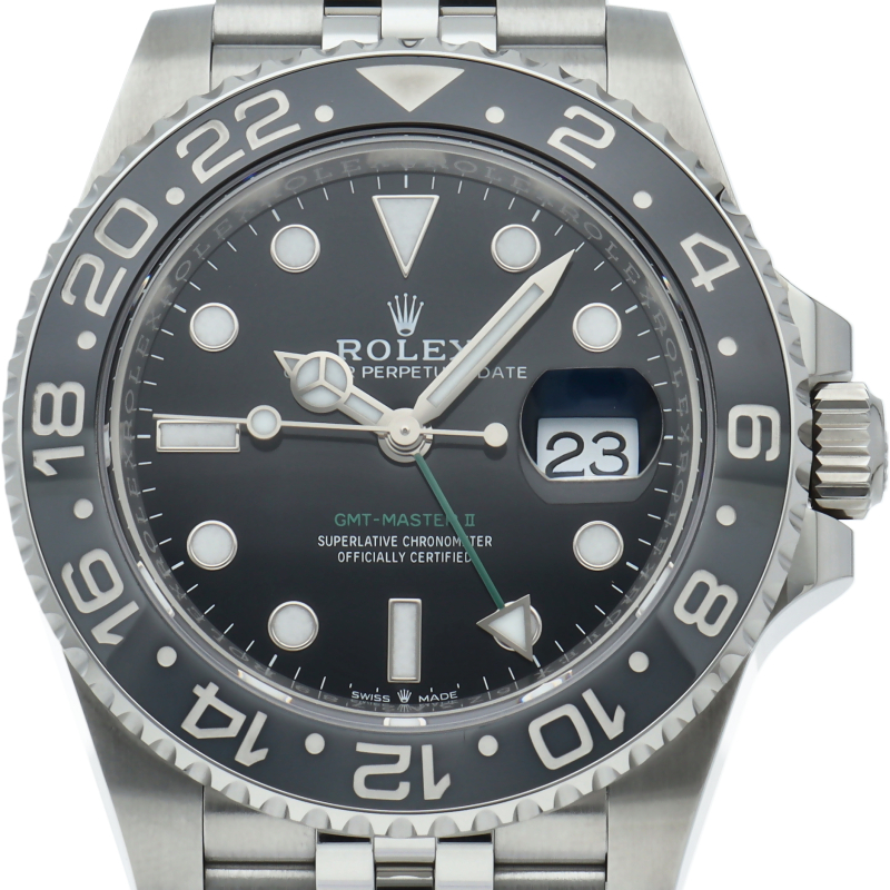 2024年に新たに加わった、グレー/ブラックベゼルにステンレスのケース/オイスターブレスレットの【126710GRNR GMTマスターII】。キャリバー3285はロレックスが特許を取得したクロナジーエスケープメントを採用し、高いエネルギー効率により70時間ものパワーリザーブを誇ります。