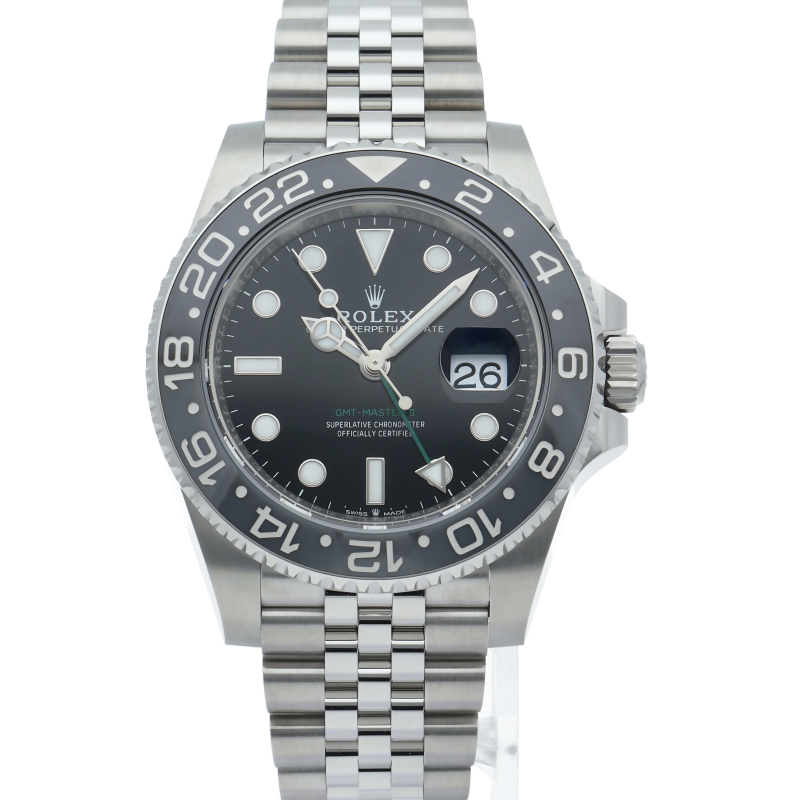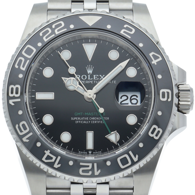 2024年に新たに加わった、グレー/ブラックベゼルにステンレスのケース/オイスターブレスレットの【126710GRNR GMTマスターII】。キャリバー3285はロレックスが特許を取得したクロナジーエスケープメントを採用し、高いエネルギー効率により70時間ものパワーリザーブを誇ります。