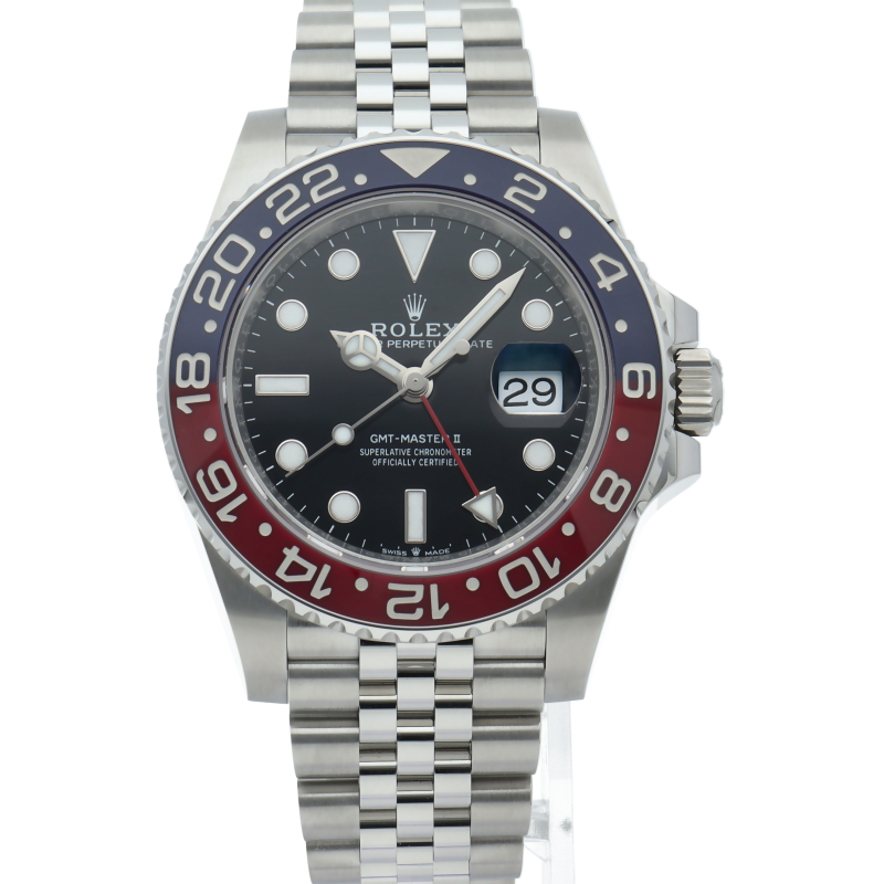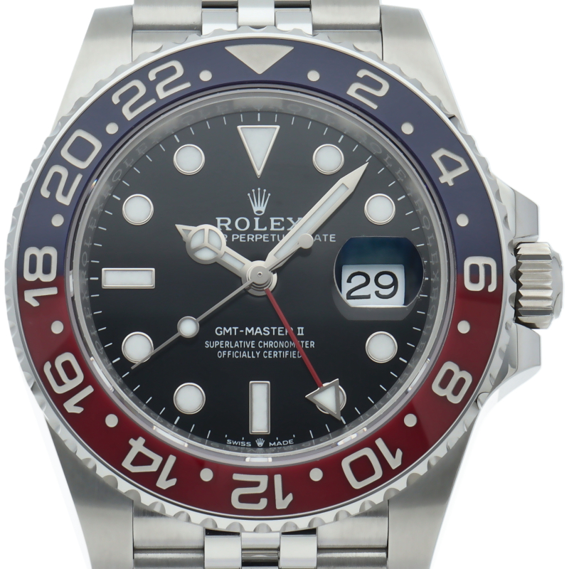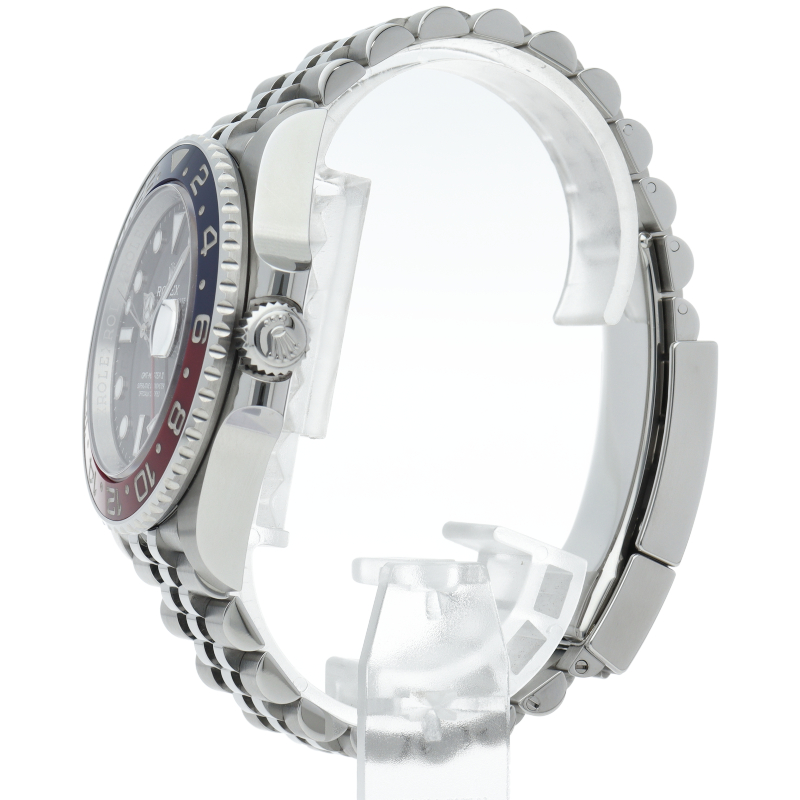 ロレックス人気モデル「GMTマスター2」のモデルチェンジした新型モデルです。セラミックベゼルにブレスやバックルも新しくなり高級感が更に増した1本です。
