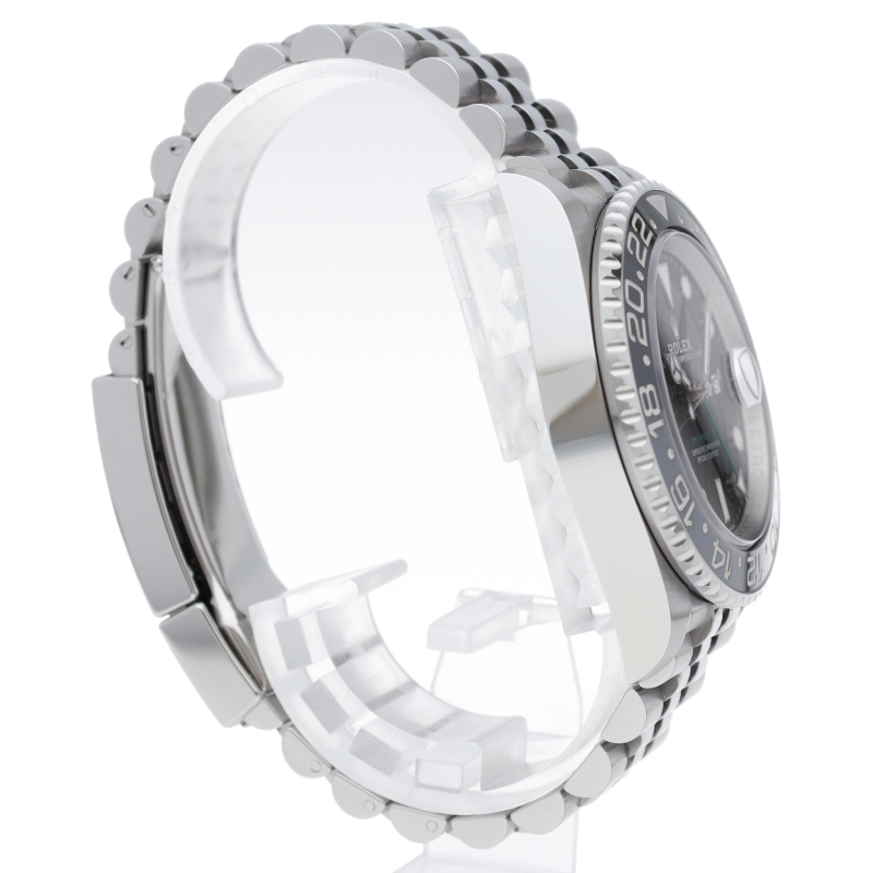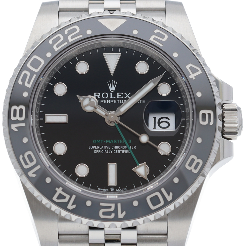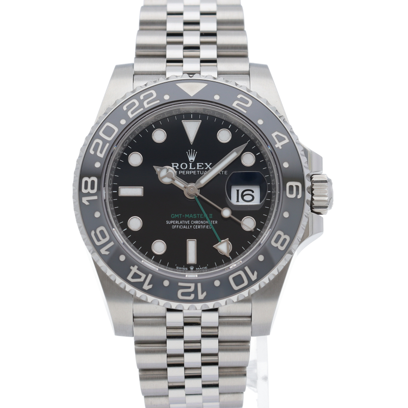 2024年に新たに加わった、グレー/ブラックベゼルにステンレスのケース/オイスターブレスレットの【126710GRNR GMTマスターII】。キャリバー3285はロレックスが特許を取得したクロナジーエスケープメントを採用し、高いエネルギー効率により70時間ものパワーリザーブを誇ります。