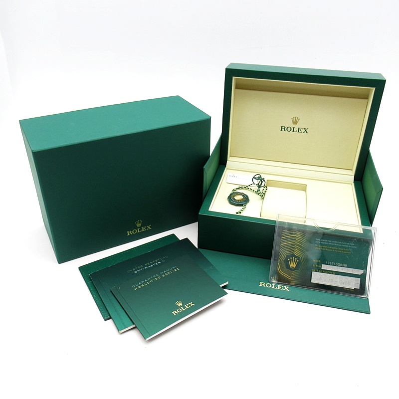 2024年に新たに加わった、グレー/ブラックベゼルにステンレスのケース/オイスターブレスレットの【126710GRNR GMTマスターII】。キャリバー3285はロレックスが特許を取得したクロナジーエスケープメントを採用し、高いエネルギー効率により70時間ものパワーリザーブを誇ります。