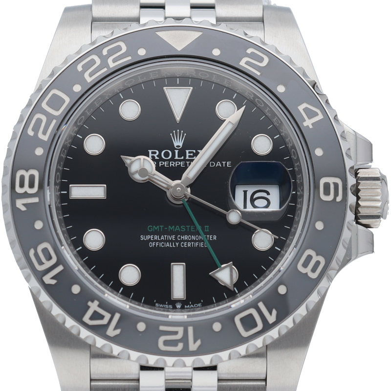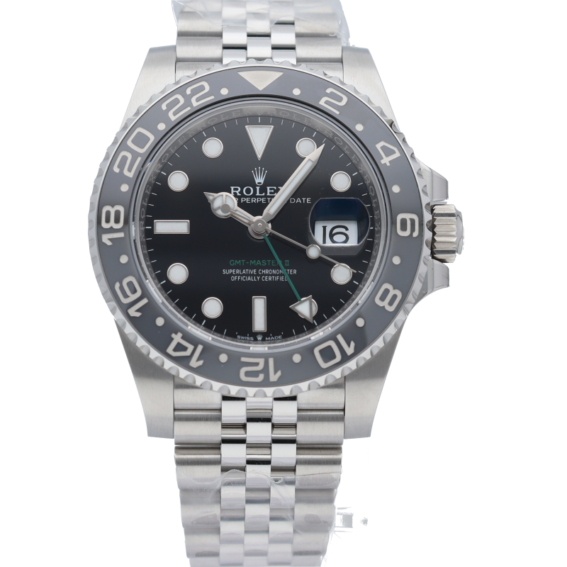 2024年に新たに加わった、グレー/ブラックベゼルにステンレスのケース/オイスターブレスレットの【126710GRNR GMTマスターII】。キャリバー3285はロレックスが特許を取得したクロナジーエスケープメントを採用し、高いエネルギー効率により70時間ものパワーリザーブを誇ります。