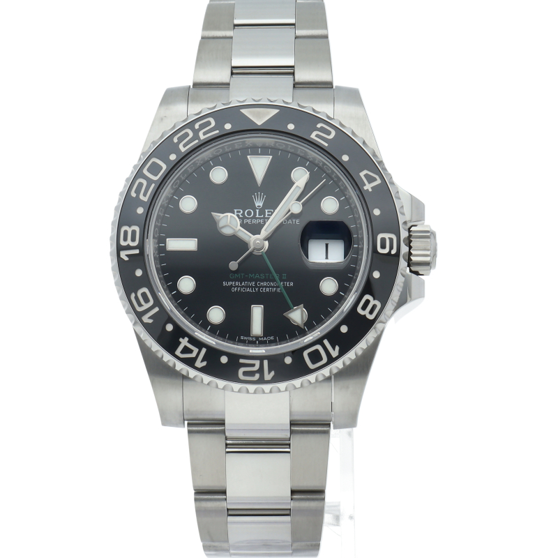 ロレックス人気モデル「GMTマスター2」。2019年に生産が終了となったセラミックの黒ベゼルは実用性はもちろん、これからの相場が楽しみな1本です。