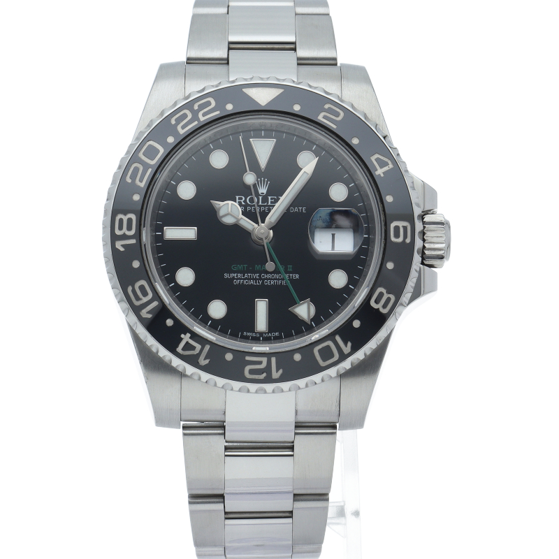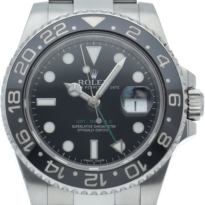 ロレックス人気モデル「GMTマスター2」。2019年に生産が終了となったセラミックの黒ベゼルは実用性はもちろん、これからの相場が楽しみな1本です。